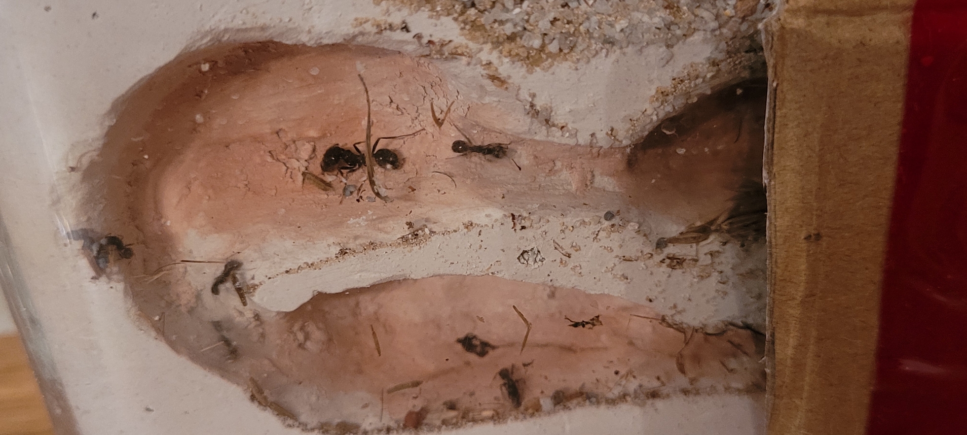 Bisher habe ich ihnen immer Körner direkt auf dem Nest "angeboten", da sich ja nur ganz selten eine Arbeiterin in die Arena verirrt hatte. Und dort haben sie sich meistens nur die Chiasamen "rausgepickt" und den Rest liegen lassen.