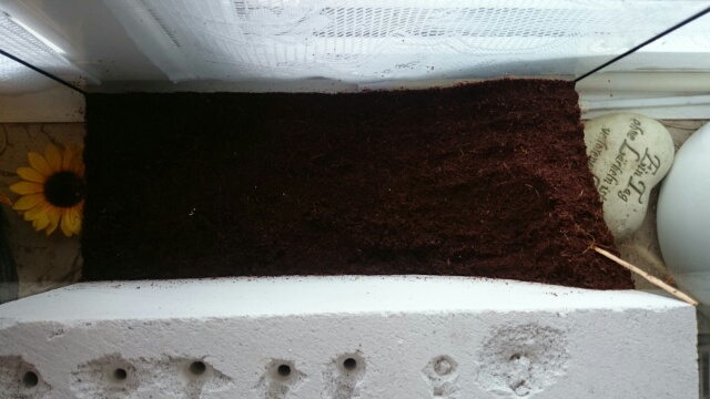 Ich habe ein Aquarium 50x30 besorgt, ca 47 Liter. Da habe ich ein 49x10 Ytong Nest rein gesetzt, der Boden besteht aus 100% natürlichem Boden ohne Zusätze nämlich Kokosfaser Erde ist super das Zeug und speichert gut das Wasser.