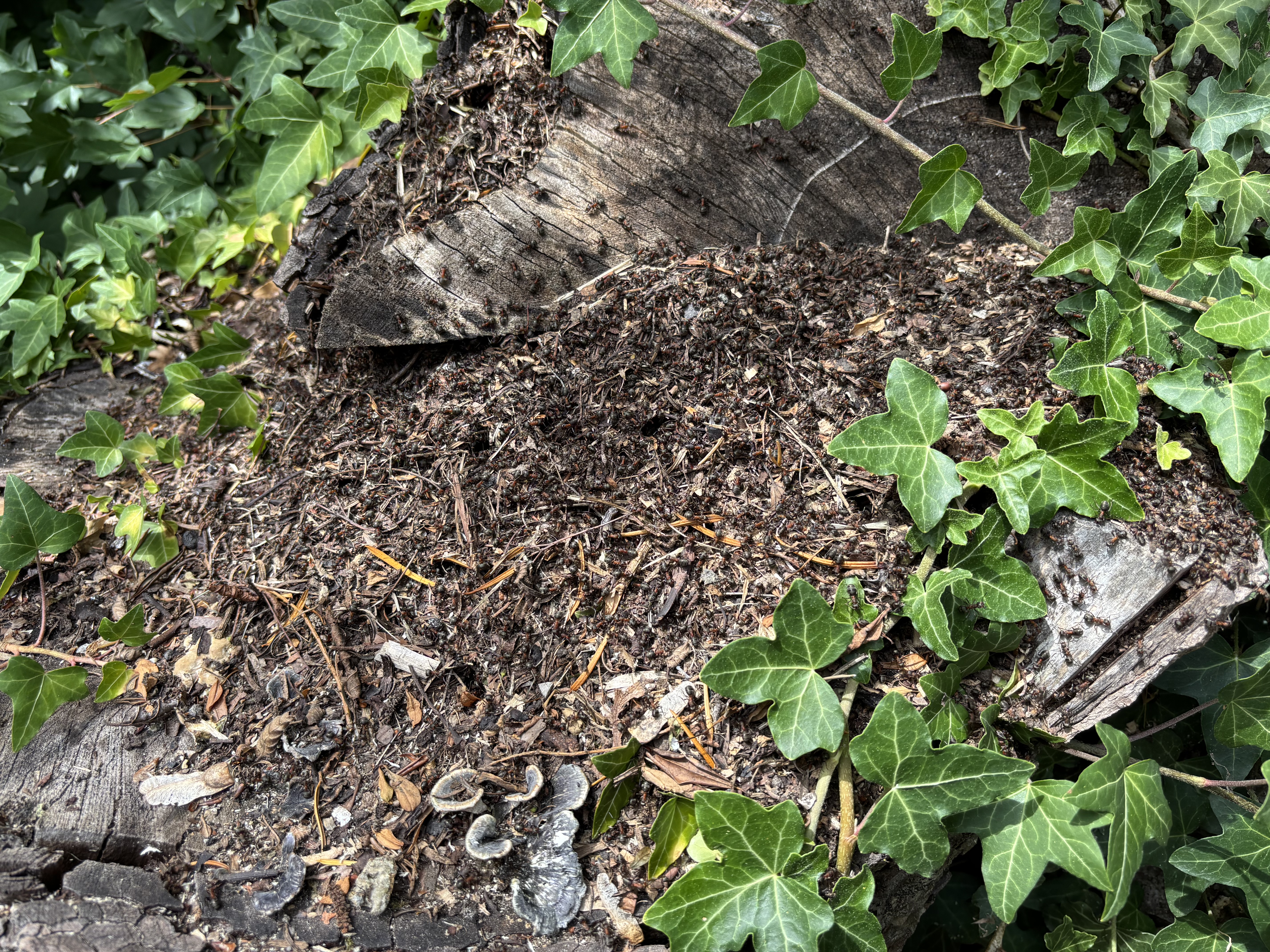 Okay die Ameisen hast du gut bestimmt, das sind zweifelsfrei hügelbauende Waldameisen. Mit dem Efeu ist dein Instinkt sicherlich auch richtig. Ein vorsichtiges Beschneiden würde ein Uberwuchern verhindern. Pass nur bitte auf dich auf, diese Ameisen sind sehr territorial und gehören zu den aggressivsten in Deutschland. Der Nestbereich wird verteidigt, wenn es sein muss auch gegen einen Menschen. Aber du erscheinst mir sehr fachlich fundiert und wirst sicher auf dich Acht geben. Darf ich fragen, ob du aus einem naturnahen Berufszweig kommst? Oder ist das nur persönliche Leidenschaft?