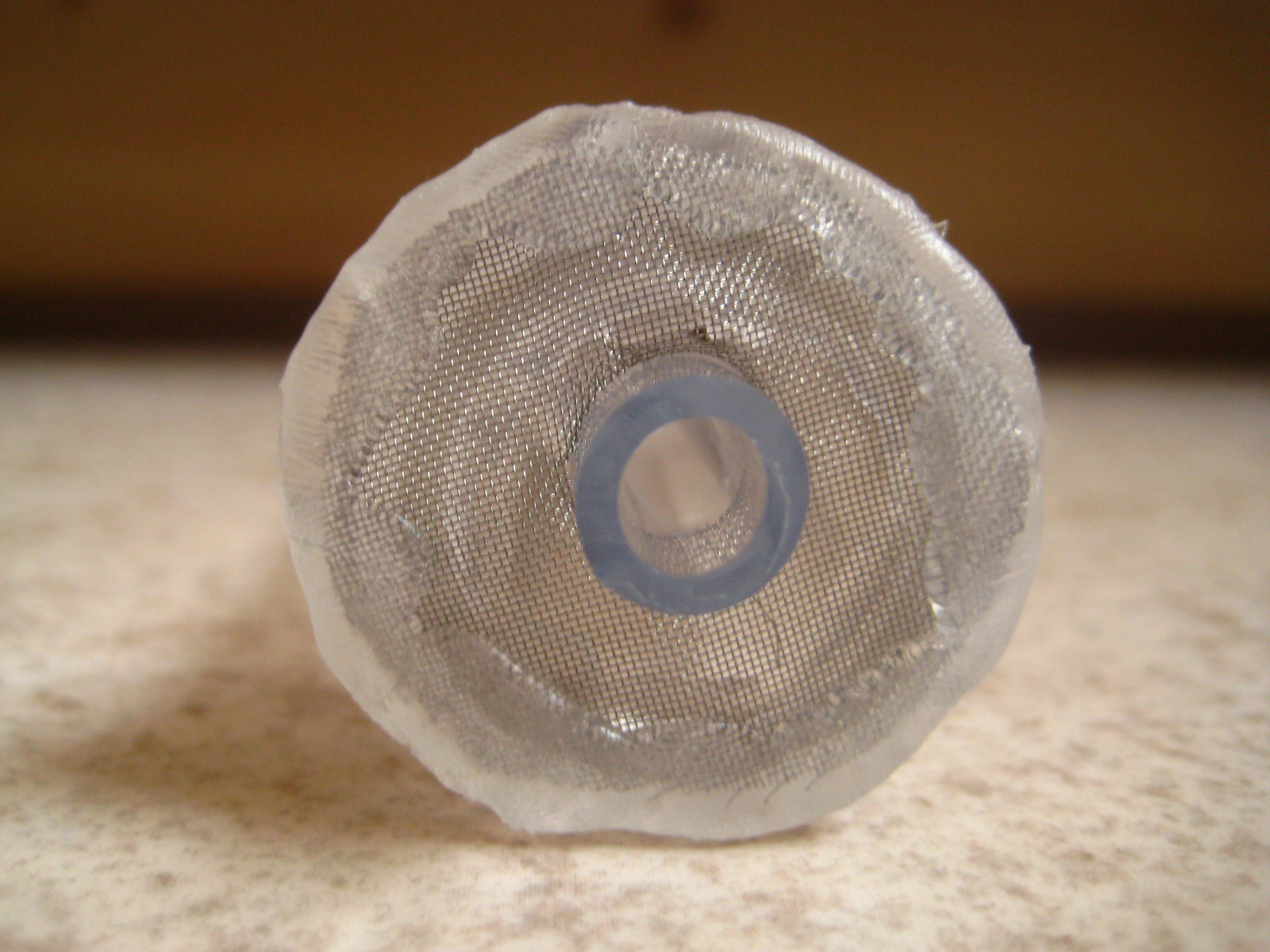 Mit einer Säge habe ich vorsichtig das 27mm Durchmesser Plexiglasrohr zersägt. Benötigen tue ich nur ein Feuerzeug großes Stück. Dieses habe ich auf einer Seite mit sehr feiner Gaze verschlossen, in dessen Mitte ich ein kleines Loch schnitt, durch das ich ein dünnen Schlauch von einem Innendurchmesser von 6mm und einer Wandstärke von 1,5mm durchsteckte.