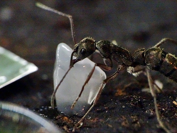 . Es ist schon irgendwie erstaunlich, dass die Ameisen es schaffen, Stücke aus dem doch recht weichen Jelly zu schneiden und diese dann auch noch transportieren können, ohne dass das Stück zerläuft. Vielleicht sollte ich mal schauen, ob meine Odontomachus auch auf Jelly abfahren (allerdings müsste ich dann vorher welchen bestellen).
