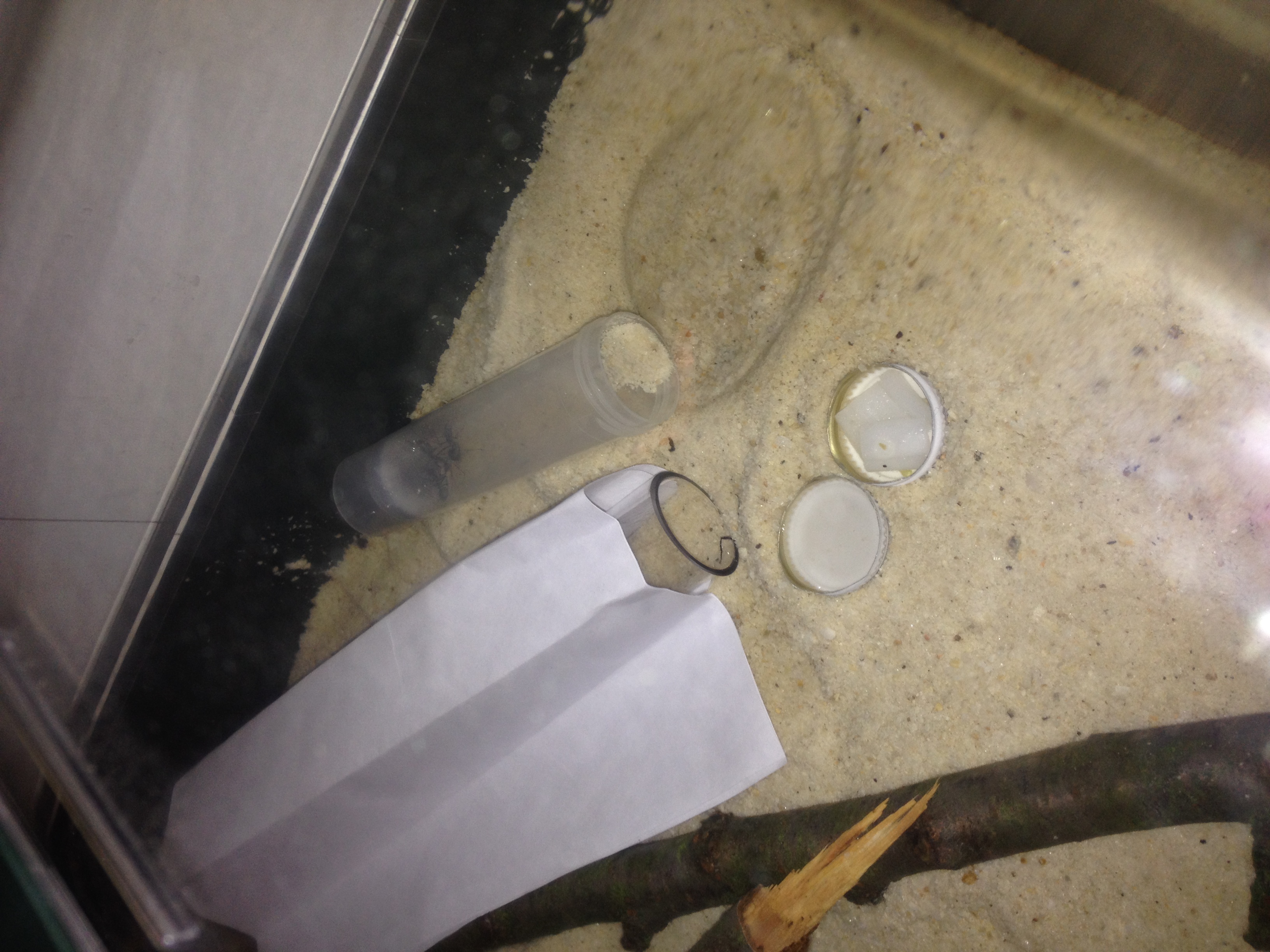 Sie wohnten bis heute morgen in dem Reagensglas, in dem sie geliefert worden sind. Ein zweites, mit frischem Wassertank, war bereit gestellt. Als ich heute morgen eine Fliege direkt vor dem Nest angeboten habe, wurde diese in das neue Nest geschleppt und angefressen. Die