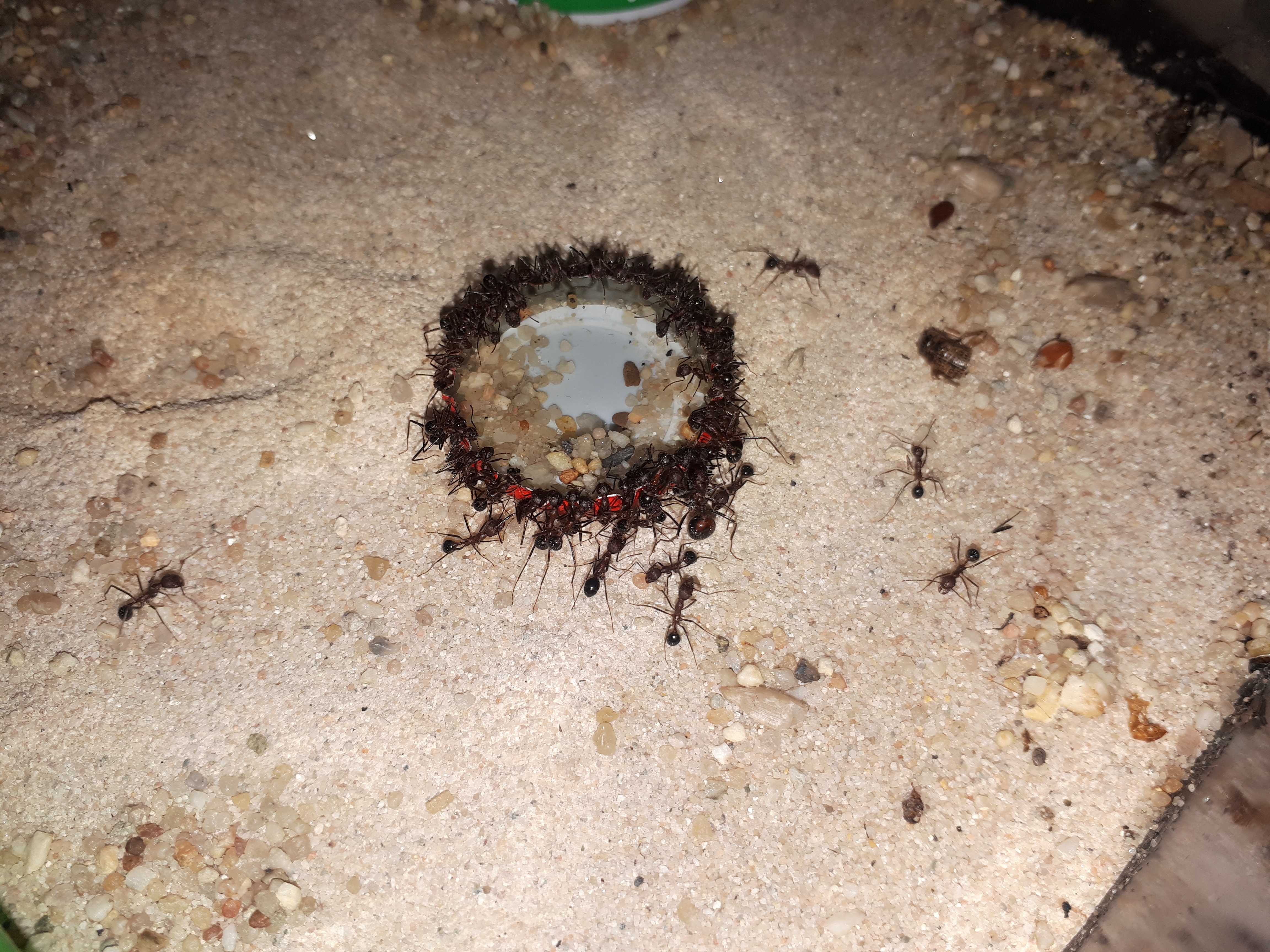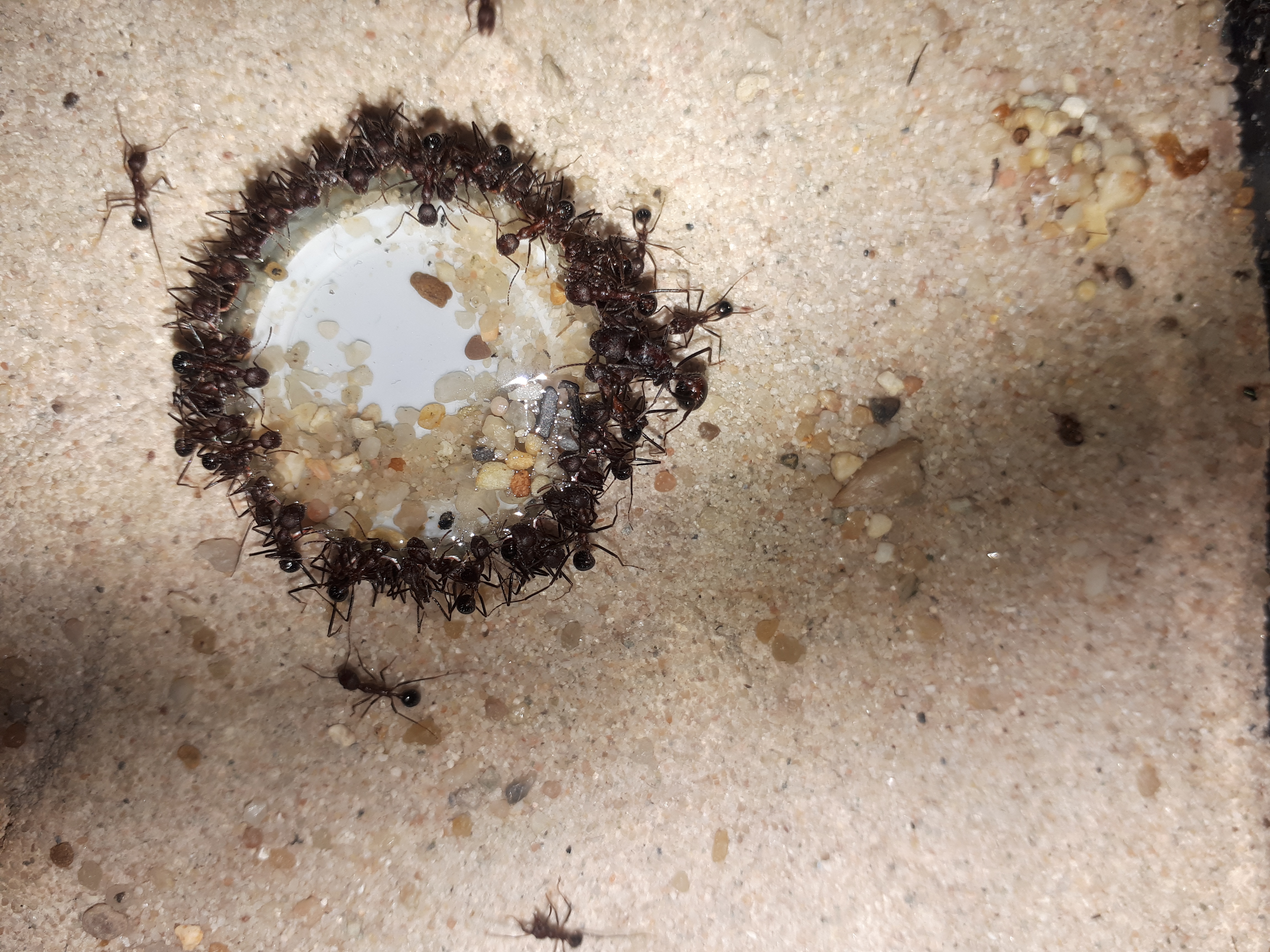 Neben ca. 50 Arbeiterinnen kam jedoch auch die Dicke mot raus und trank. Wieso? War sie so dehydriert, dass ihr das zu lange dauerte, bis die Untergebenen ihr Wasser bringen? Insbesondere, weil Novomessor cockerelli relativ langsam trinken und keinen groĂźen Sozialmagen aufweisen?