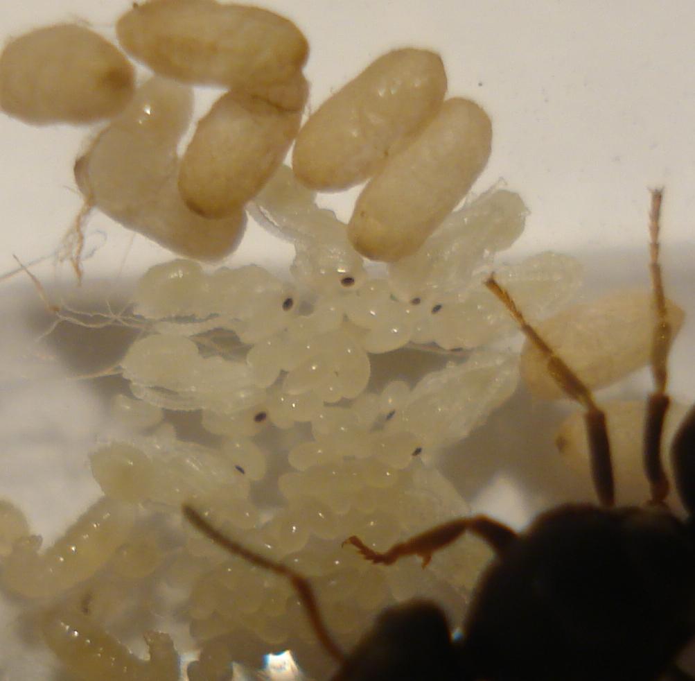 Hab eben ein Foto von Meiner Lasius cf niger Gyne gemacht und ich habe normale Puppen und Nacktpuppen im Reagenzglas.