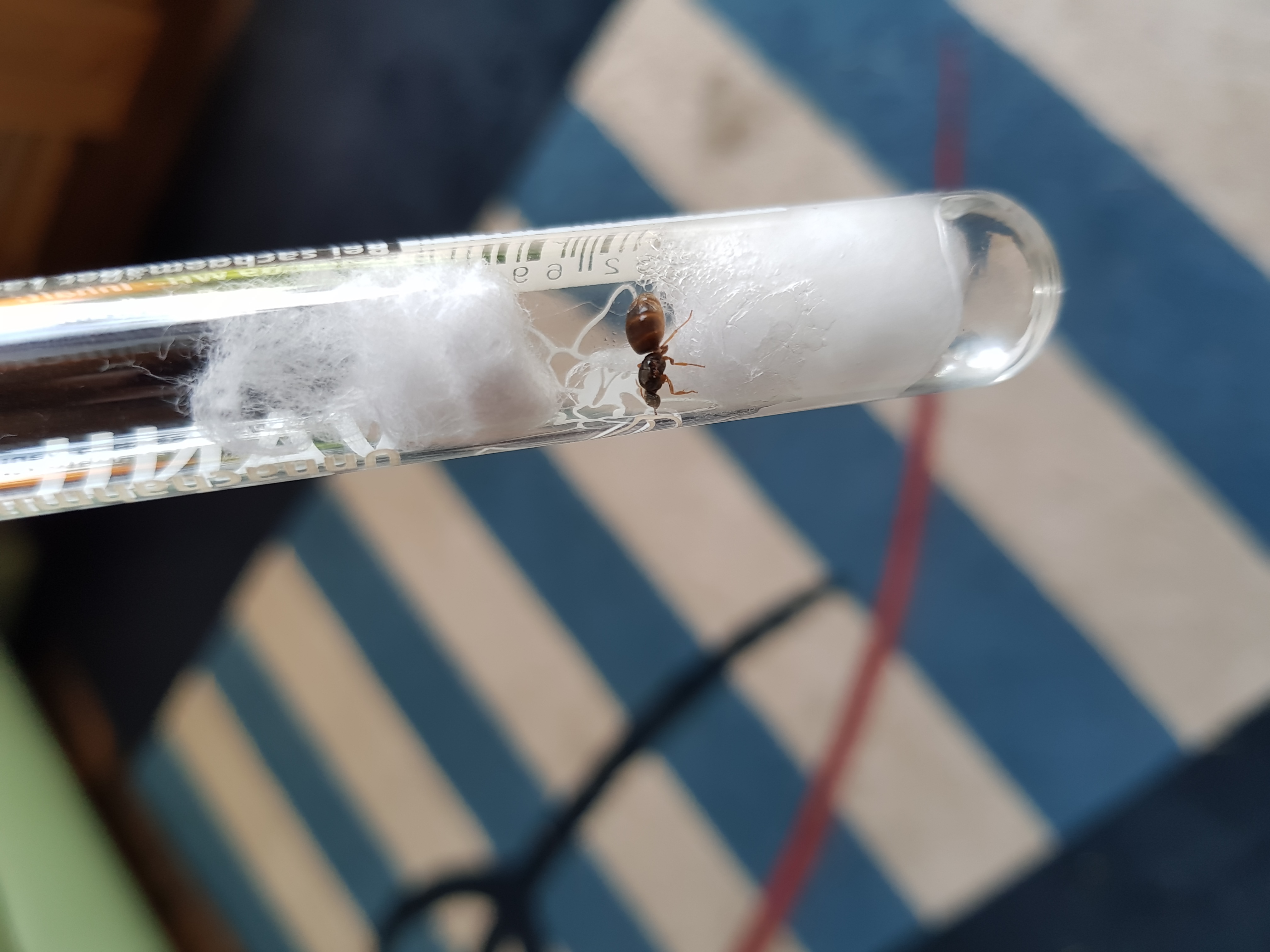 Der Wassertank ist tatsächlich zu knapp gewählt. Als Faustregel würde ich vorschlagen etwa 2/3 des Reagenzglases mit Wasser zu füllen. Das reicht meistens für die Reagenzglasphase aus. Falls sie noch keine Eier gelegt hat, würde ich sie sanft dazu bewegen in ein neues Reagenzglas umzuziehen, mit mehr Wasser (wie oben bereits erklärt). Falls sie nun schon Eier hat, was mir wahrscheinlicher erscheint, wird das ganze vermutlich schwieriger sie dazu zu bringen ihr Nest bereits jetzt zu wechseln. Du könntest sie vorsichtig mit den Eiern umsiedeln. Eine Lasius Flavus