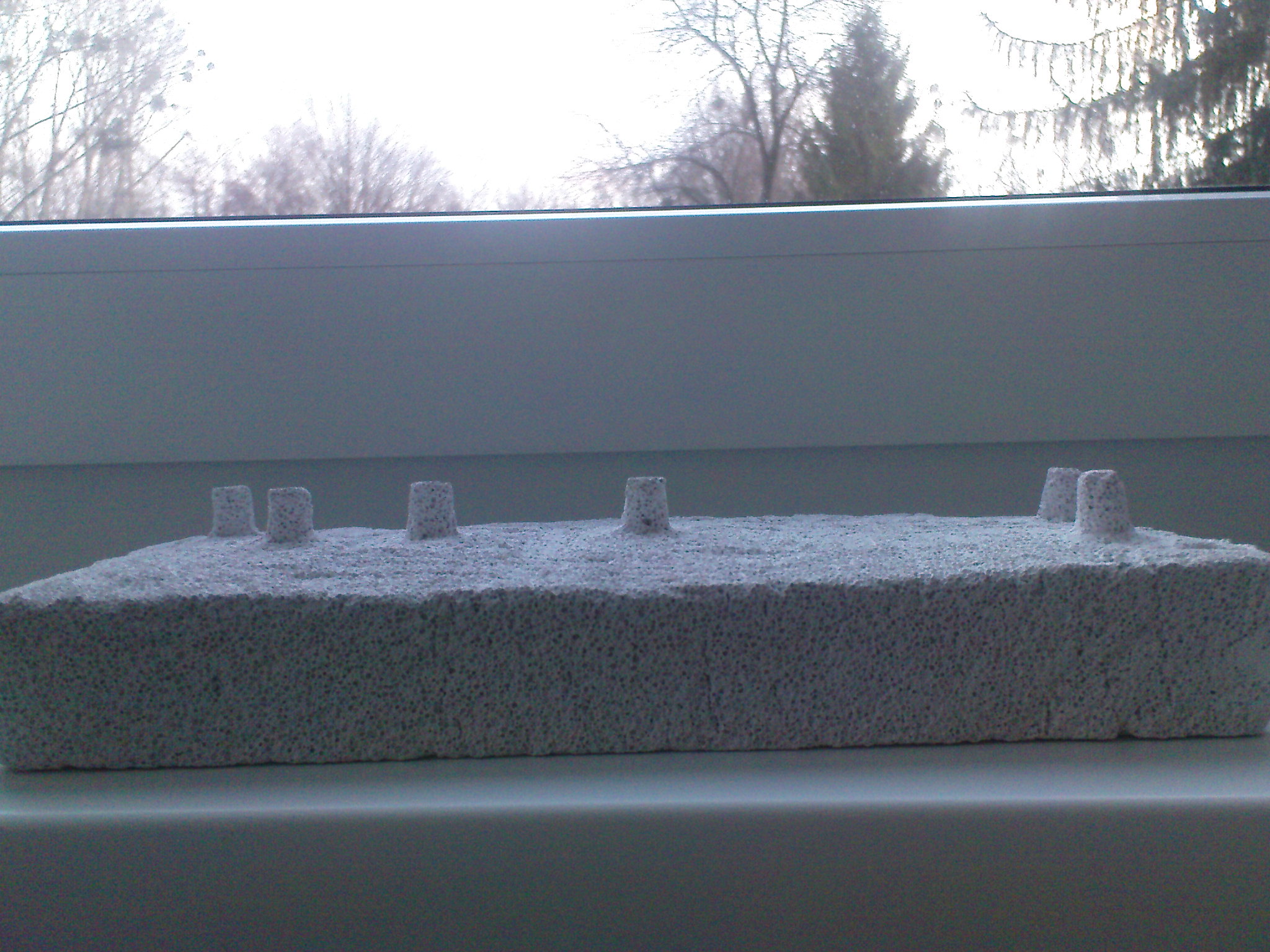 Eine aufwändige aber mit Sicherheit sehr effektive Lösungsgestaltung erschien mir, das YTongnest auf Stelzen stehen zu lassen, die ich in den Stein schnitze. Nest und Stelzen bestehen demnach aus einem Stein. Das Wasser wird dann über diese Stelzen direkt und zielgenau zu den tiefsten Kammern geleitet die es gilt zu befeuchten. Dabei galt es darauf zu achten die Stelzen direkt unter den tiefsten Kammern zu platzieren, ebenso war es wichtig, dass zwischen den Stelzen und den tiefsten Kammern wenig Material ist, denn nur so kann das Wasser zielgenau weitergeleitet werden und wird nicht im YTongstein verteilt.