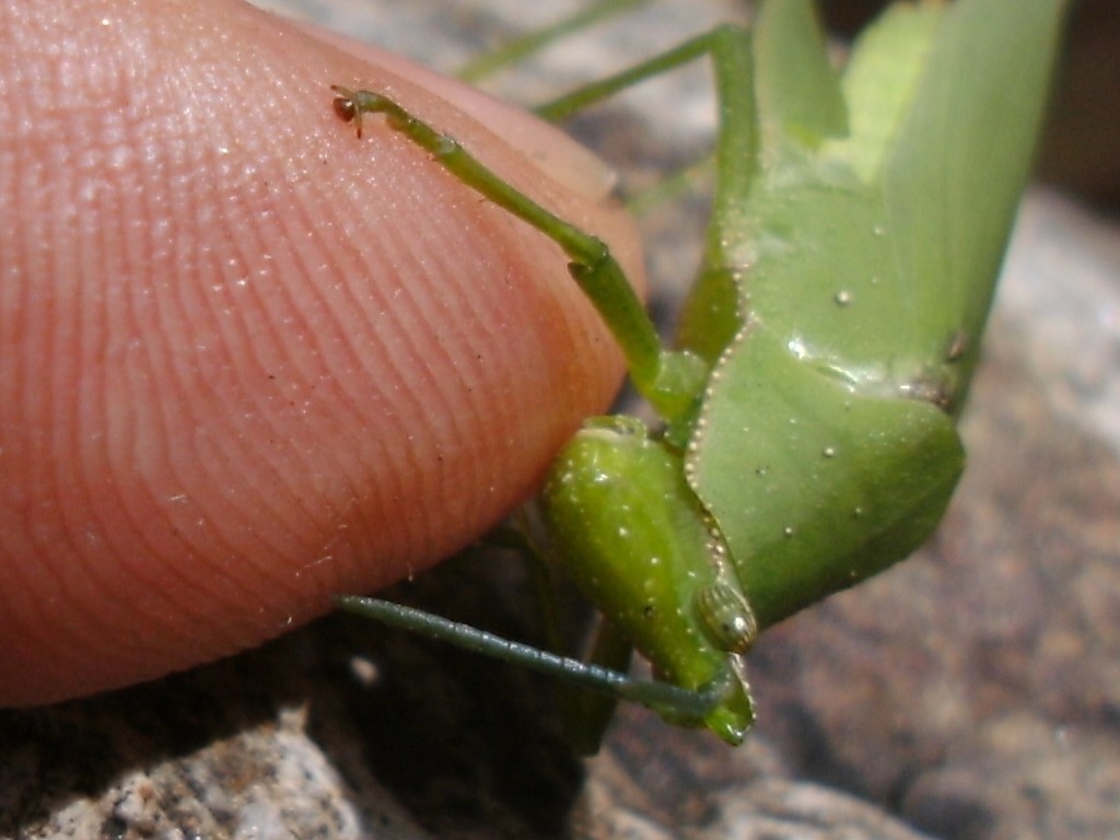 Meine Worte entsprangen aber einer anderen Geschichte. Ich hatte mal ein Sphodromantis lineola Weibchen, dass in Freizimmerhaltung leben durfte, ab und zu nahm ich sie auch auf meiner Schulter mit. Einmal hat sie sogar beim Frühstück eine heranfliegende Faltenwespe geschnappt und gefressen. Aber worauf ich hinwollte... irgendwie hat ihr das Leben in meiner Obhut gefallen, sie wurde überdurchschnittlich alt und irgendwann... (da war sie wohl schon etwas "im Delirium") ja, passierte etwas sehr unerwartetes. Wir Zwei gingen auf Zitterspinnenjagd und da begann sie mal spontan an meinem Tshirt zu fressen. DAS war sehr verstörend für mich