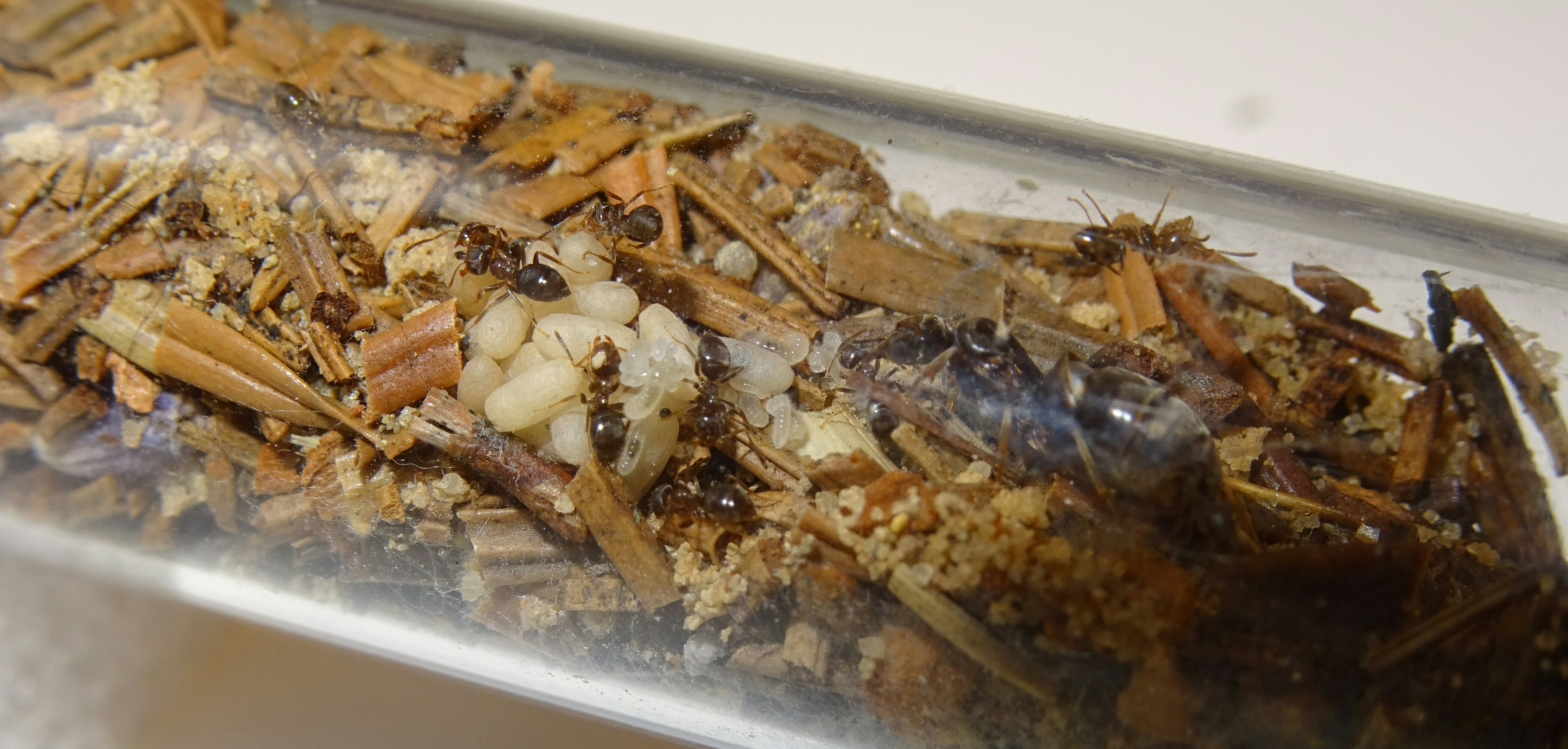 Eier, viele hungrigeLarven und ein paar Puppen sind vorhanden, zwei bis drei Arbeiterinnen sind ständig mit der Brutpflege (hauptsächlich füttern und umlagern) beschäftigt.