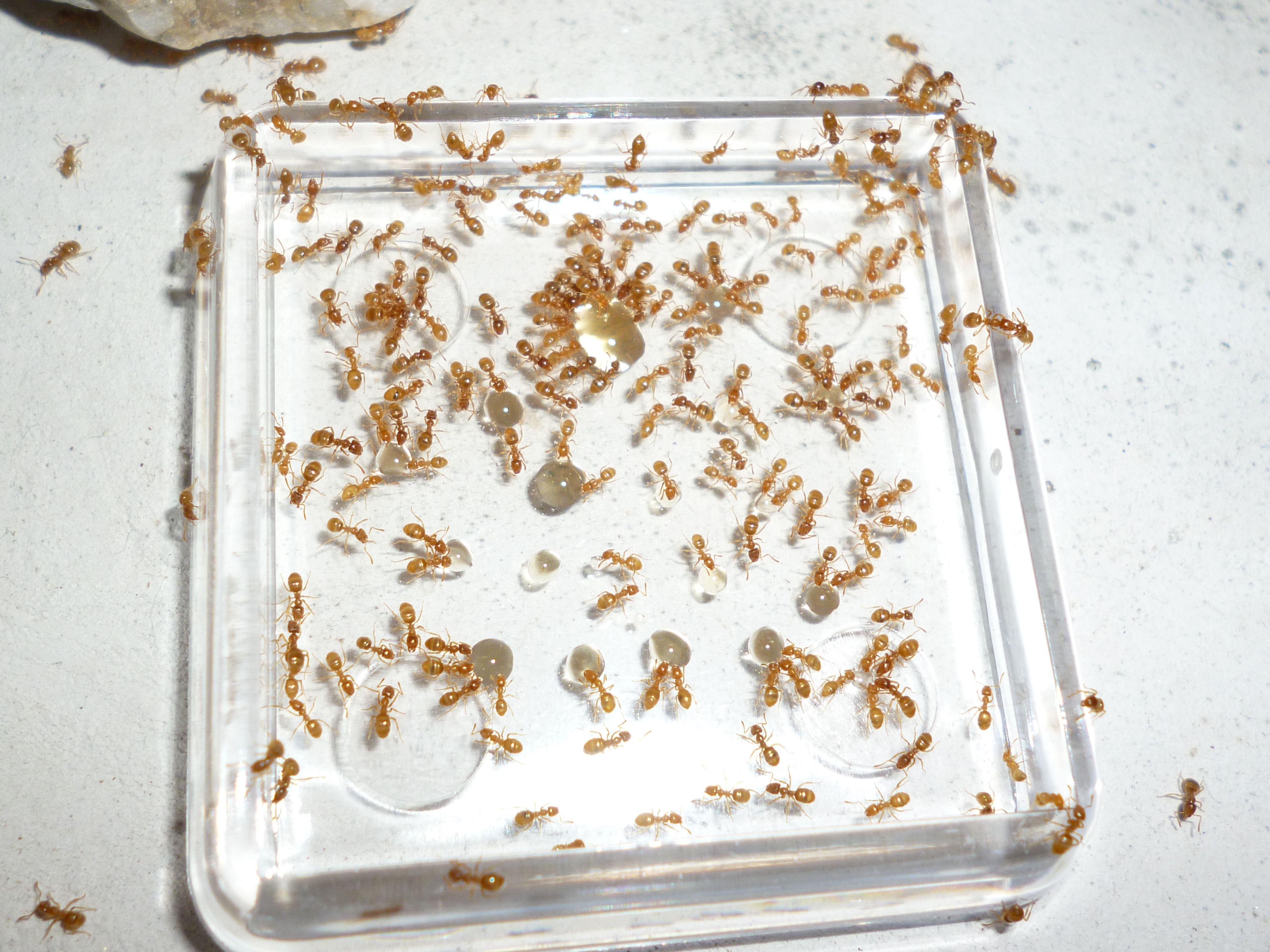 Es gab vor kurzem ein paar Tote bei der Fütterung mit Honig. Man muss bei Lasius flavus wirklich penibel darauf achten, nur winzig kleine Tropfen Honig anzubieten, sonst können sie sich nicht helfen und ertrinken darin .