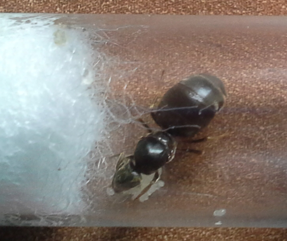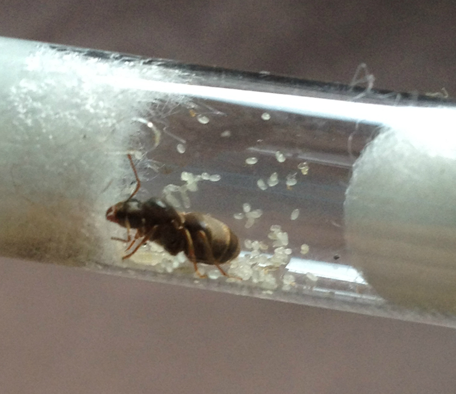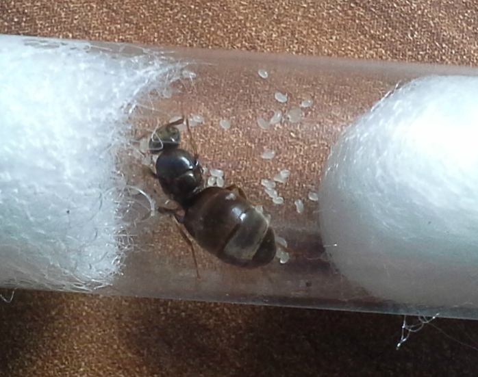 Nach einer Stunde Arbeit hatte ich dann 30 neue Reagenzgläser, die nur noch auf neue Gynen warten. Gegen 19.00 Uhr machte ich mich dann auf die Suche, allerdings ohne große Hoffnung auf Erfolg. Das Wetter war nicht optimal, eher trocken und warm. Des weiteren war die Uhrzeitschon etwas fortgeschritten. Widererwartend fand ich, diesmal jedoch punktuell und nicht so flächendecken wie am Vortag, immerhin 24 Lasius cf. niger Gynen. Somit sind es genau 31 Gynen, vermutlich sogar
