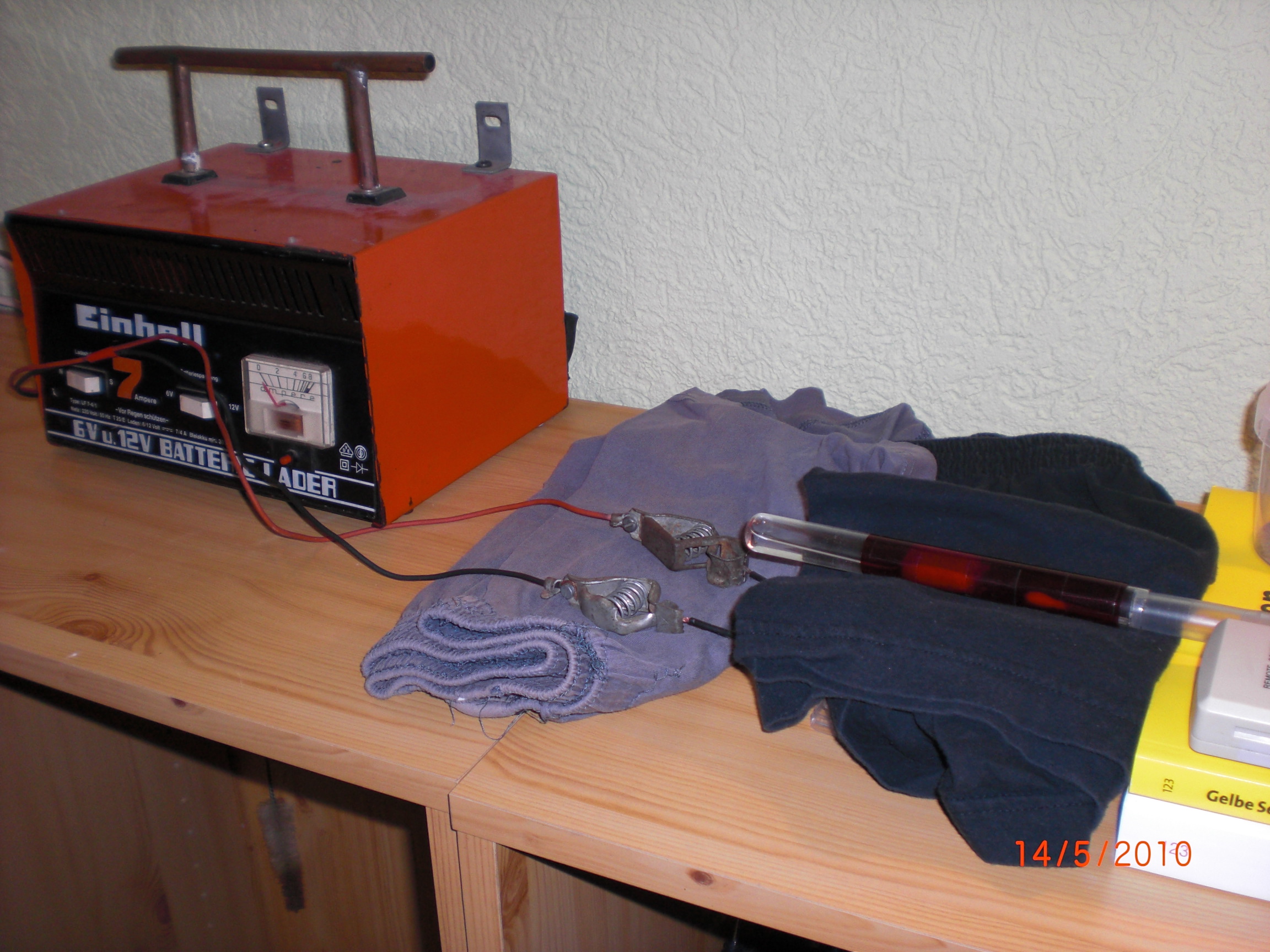 Datum: 10.05.10 Heute hab ich einen Heizstein aus verlöteten Widerständen gebaut, da die Temperatur in meinem Zimmer (18°C) in den letzten Tagen nicht sehr hoch war. Der Aufbau ist in Bild 10 dargestellt. Den Heizstein packte ich unter das RG der 2.