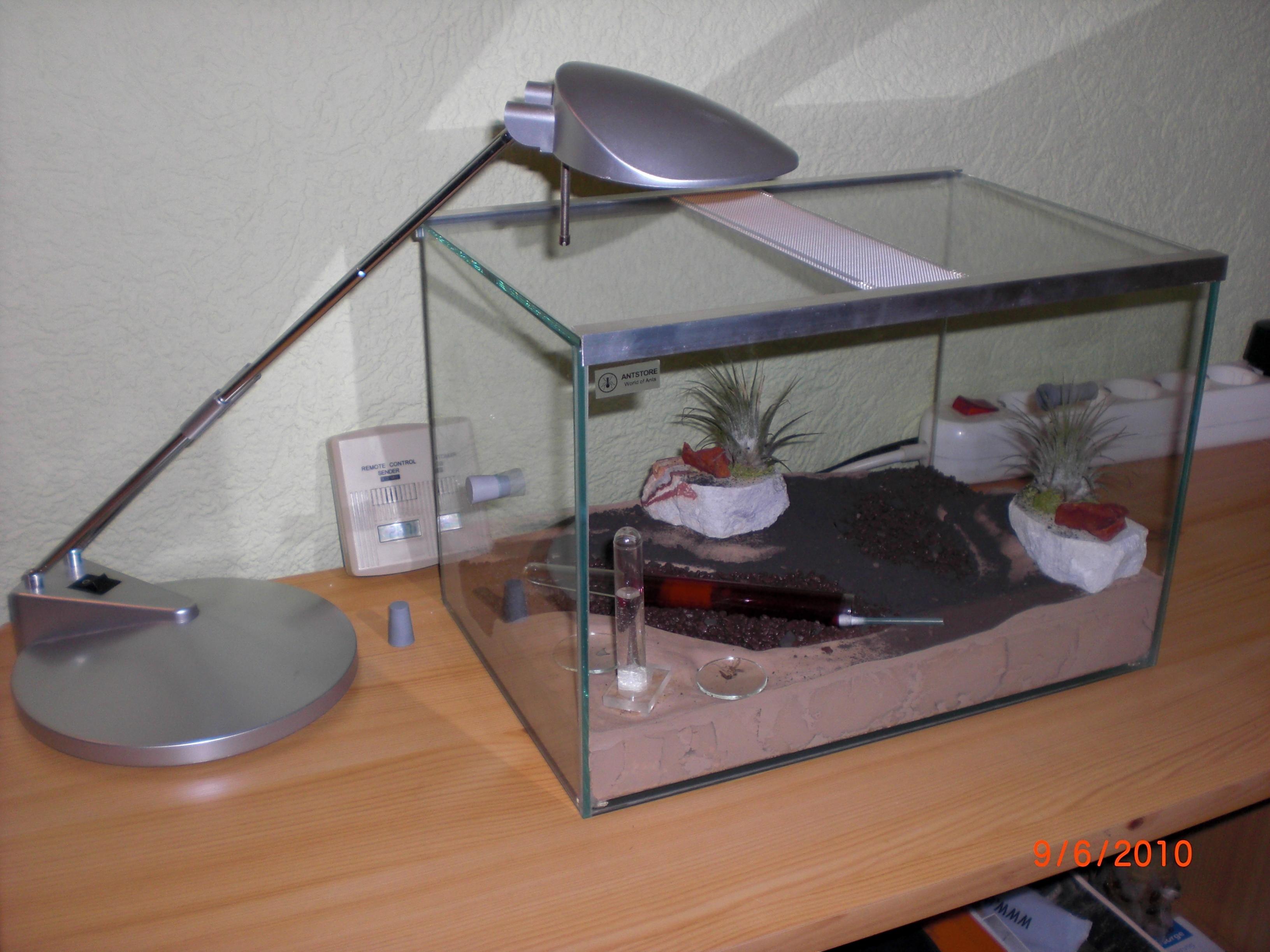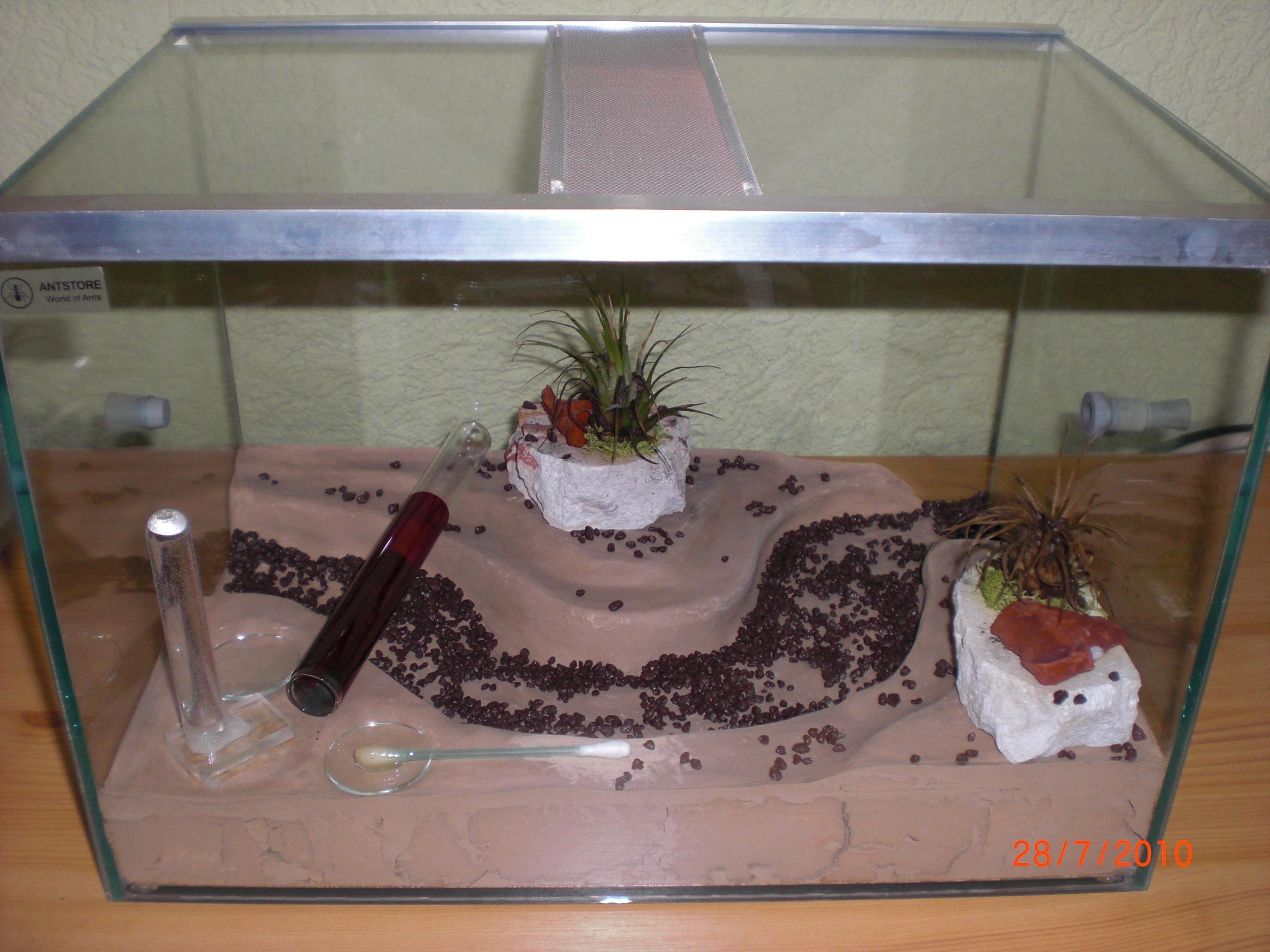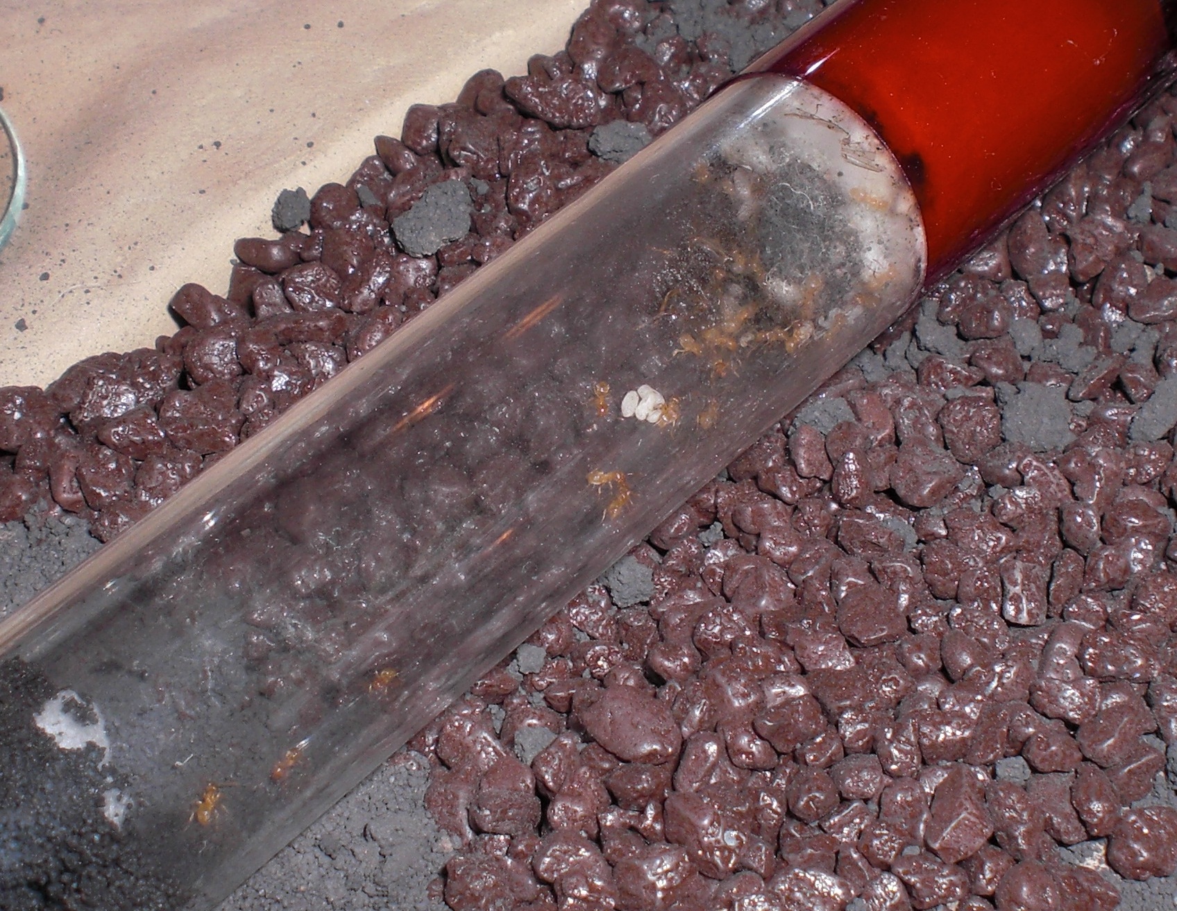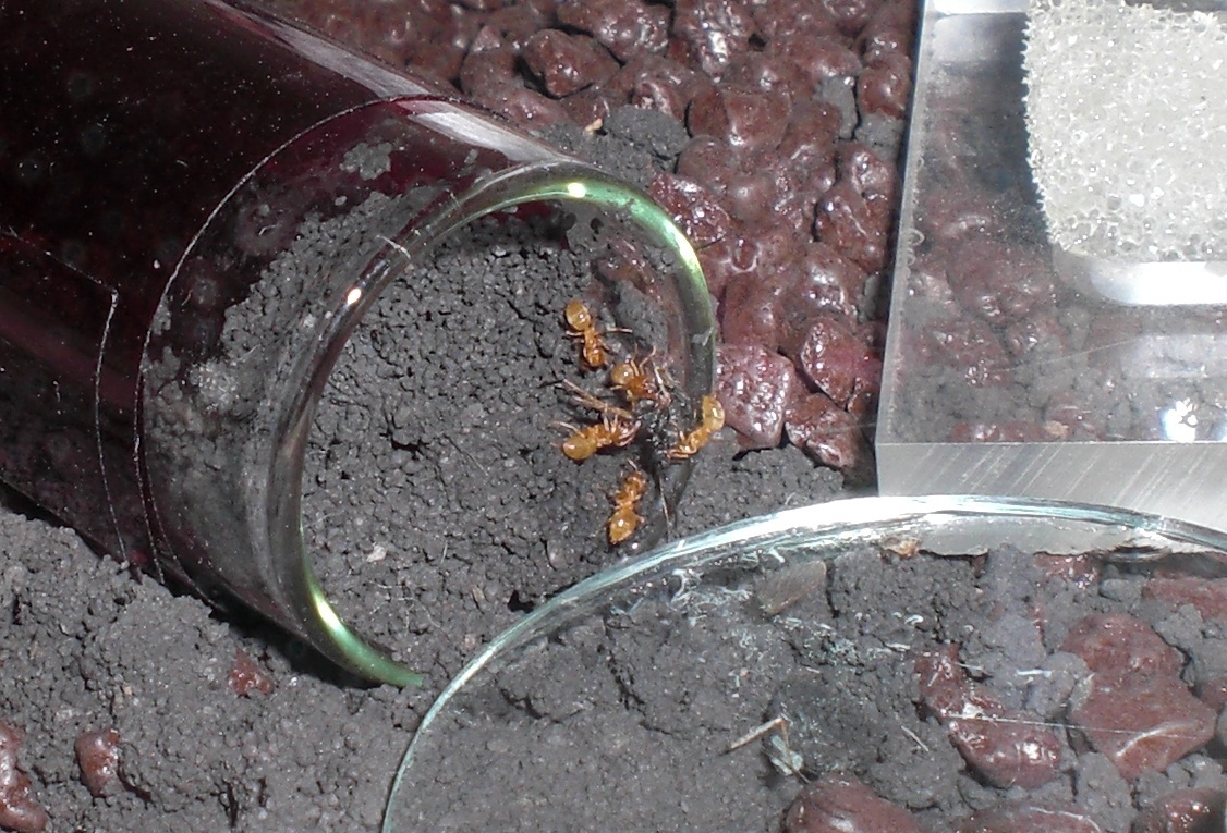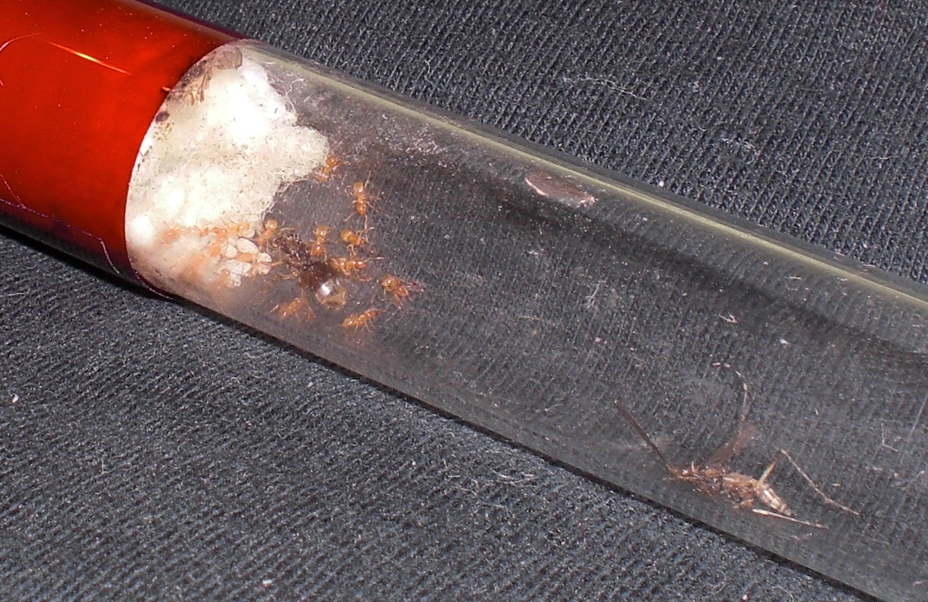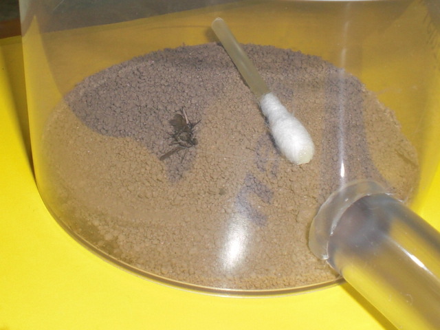 Datum: 14.05.10 Vor zwei Tagen legte ich ein Wattestäbchen mit Honig in die „Mini-Arena“. Dieses lockte heute eine Pygmäe an. Nachdem ich diese ein wenig begutachtete legte ich eine Mücke hinzu, die bisher jedoch nicht von Interesse war (siehe Bild 11).