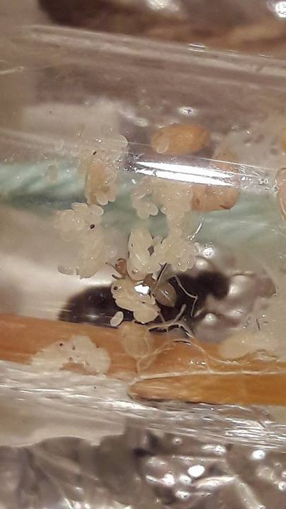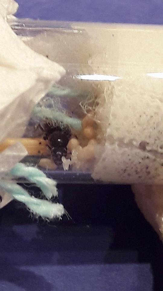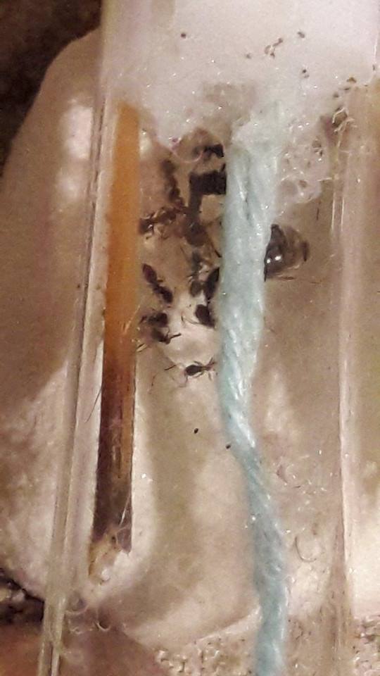Habe beiden Völkern gestern je eine ausgewachsene männliche Zitterspinne angeboten, die gut angenommen wurde. Mal ne nette Abwechslung gewesen, nach den Dörrobstmotten, diversen Mücken und dem selten angebotenen Zahnstocher mit Hundefutter-Resten (was sie auch gut annehmen)!