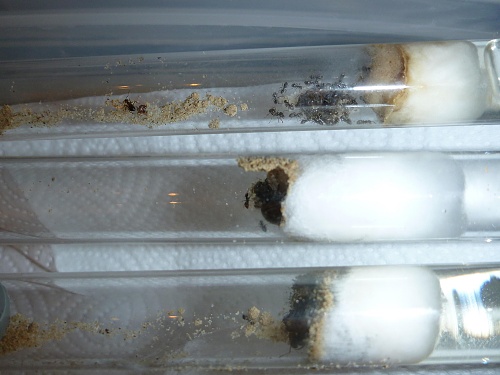 Man vergleiche mal mit den letzten Bildern, wo sie sich nicht eng zusammengehockt haben um weniger Feuchtigkeit zu verlieren. Da war das Reagenzglas noch bis zur Watte voll mit Ameisen, jetzt scheint es als wären es nur noch halb so viele. Erstaunlich, wie sie sich zusammenkugeln können, ohne ihre Beine zu verknoten.