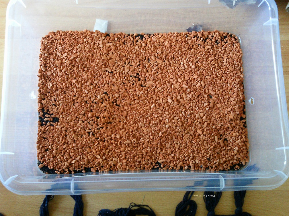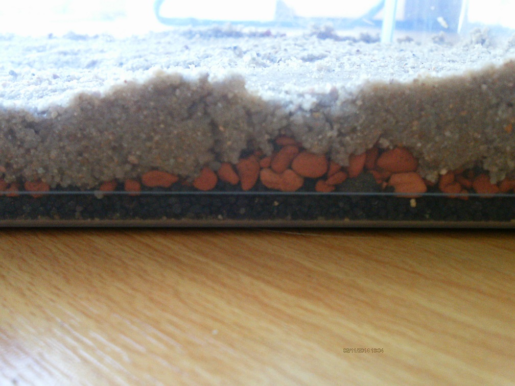 Rechts, in ihrem Abfallhaufen erkennt man etwas längliches, weißes. Das ist ein Larvenstadium von irgendetwas, dass sich aber bei der Temperatur nicht weiterzuentwickeln scheint. Da beide Tierarten an ihrem Platz bleiben und für die Ameisen keine Gefahr zu drohen scheint, lasse ich es wo es ist. Mal sehen, was es wird. Eine Motte vielleicht?