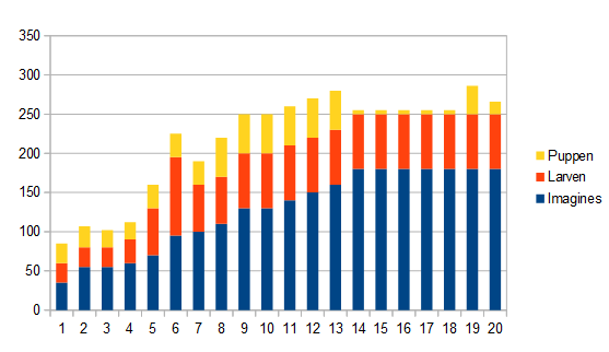 Der Vollständigkeit halber hier auch das Diagramm der Vermehrung. Die Eier konnte ich noch nie zählen, deswegen hab ich sie weg gelassen. Bleiben die Zahlen lang gleich, hab ich entweder nicht gezählt in der Woche, oder es ist optisch alles beim Alten geblieben.