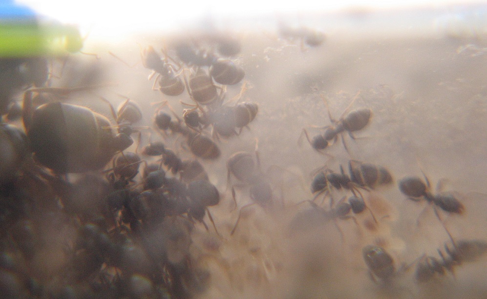 Das hier sind die letzten verbliebenen Arbeiterinnen mit ihrer Gyne im Reagenzglas. Trotz fehlender Schärfe kann man wunderbar die prall gefüllten Gaster erkennen.