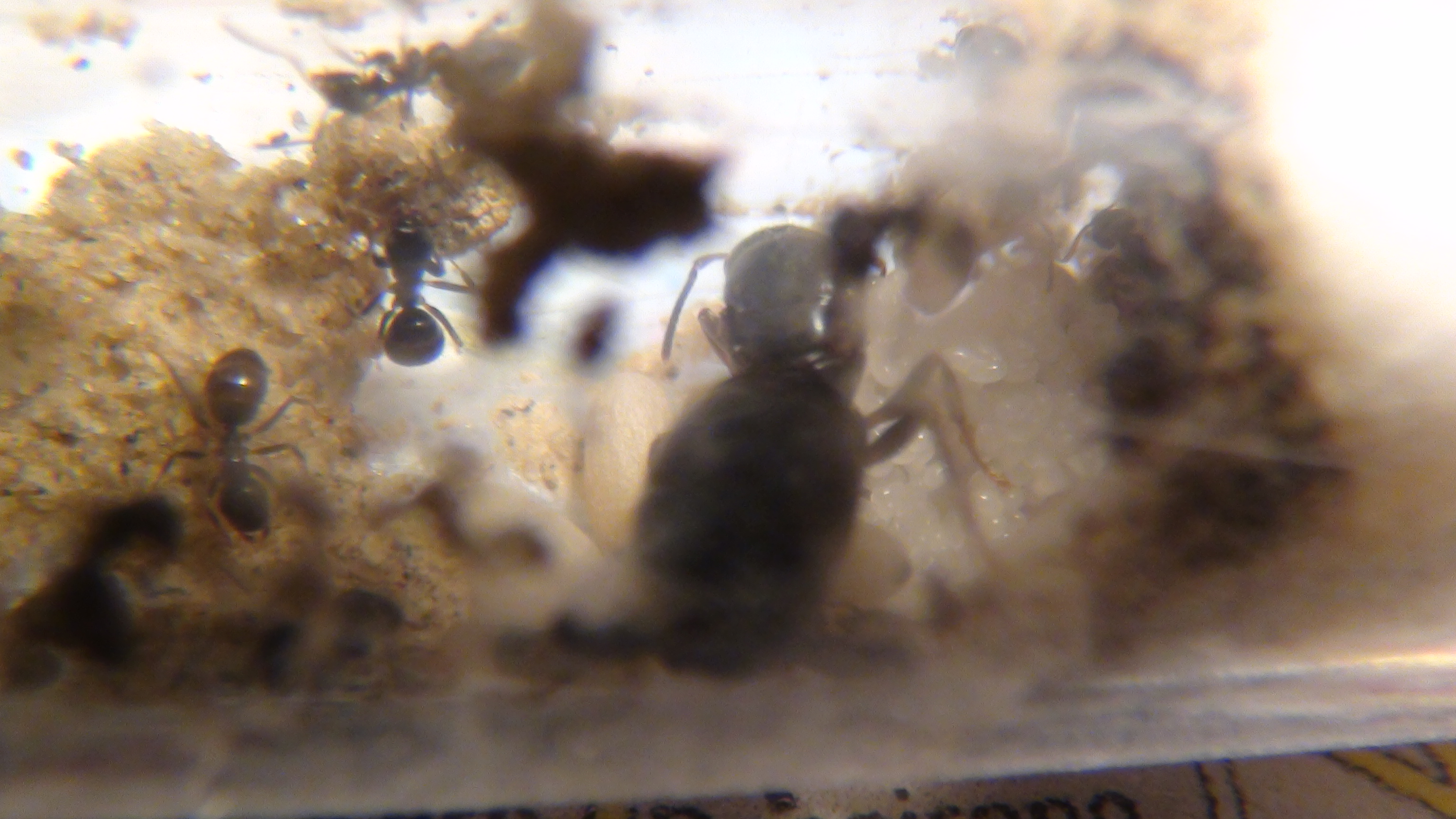AllgemeinIch bin mit der Kolonie sehr zufrieden. Sie entwickelt sich super und hat mir bis jetzt noch keine Probleme gemacht. Natürlich macht nicht nur das eine Kolonie aus. Es gibt auch immer etwas zu beobachten. Mittlerweile haben sie einen ganz kleinen Eingang und einen grossen Dreckwall gemacht. Auch die Wände sind im Nestbereich grösstenteils "zugepflastert". Die