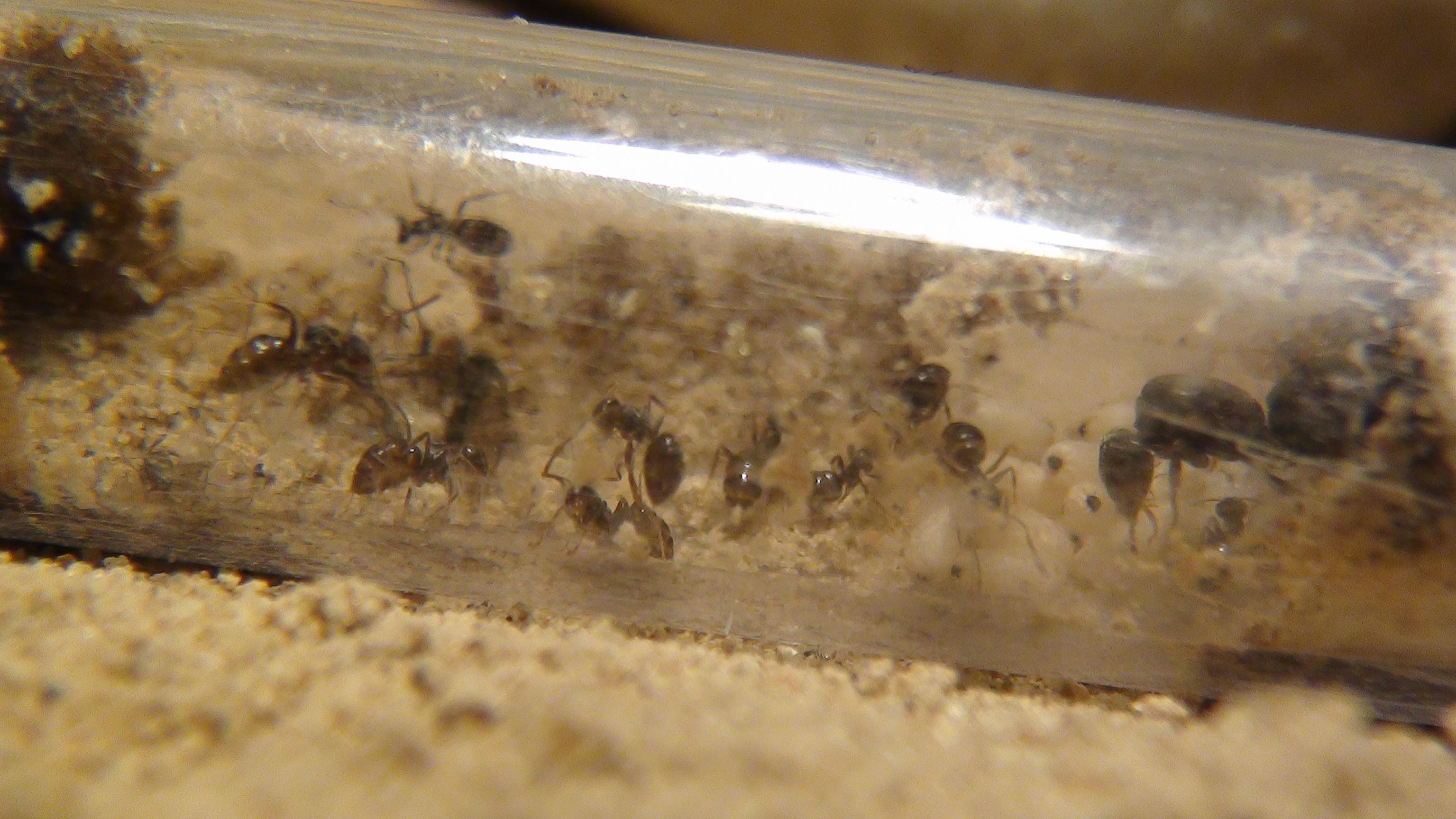 Was mir noch aufgefallen ist, dass sie immer Löcher in den Boden gegraben haben. Bald haben sie gemerkt, dass es nicht weit runter geht. Trotzdem machten sie weiter. Am Anfang störte es mich, später war es mir dann egal. Es passierte auch nichts. So wie ich es sehen konnte, waren die Löcher verbunden, es waren aber fast keine Ameisen da unten. Was man aber gut sehen konnte, dass die Sand-Lehm Mischung an den Eingängen feuchter war als der andere Bodengrund.