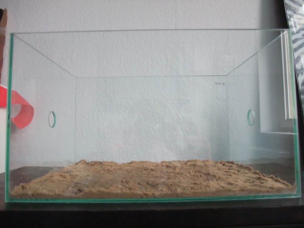 Damit die Sand-/Lehmmischung besser trocknet habe ich den Deckel einen Tag lang von dem Becken entfernt. Nach so knapp 1-1,5 Tagen war die Mischung dann auch gut getrocknet. Leider stelle ich aber eher weniger Änderung in der Beschaffenheit des Gemisches zu vorher fest.