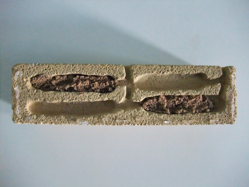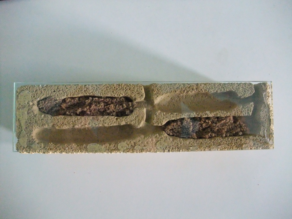 Als erstes habe ich noch zwei der vier Kammern mit etwas Sand-/Lehmgemisch gefüllt um den Platz ein wenig zu reduzieren. Wenn das Nest am Anfang zu groß ist, dann kann es passieren, dass die Ameisen einige Kammern als Müllablage benutzen und dies sieht sicher nicht nur hässlich aus sondern könnte auch für Milbenbefall sorgen. Außerdem fühlt sich die Königin samt junger Kolonie in kleineren Nestern wohler. Bei Bedarf können die Kleinen dann die anderen Kammern freigraben.