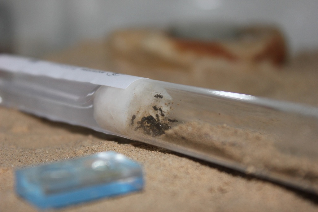 Rundum würde ich meinen geht es meinen Ameisen sehr gut. Sie nehmen Honiglösung und Proteine auf und auch am Wasser sind sie ab und an zu sehen. Es gibt Tage da sind sie sehr ruhig und selten schaut dann eine Arbeiterin raus und an anderen Tagen laufen gleich sechs, sieben oder gar acht Arbeiterinnen in der Arena umher.