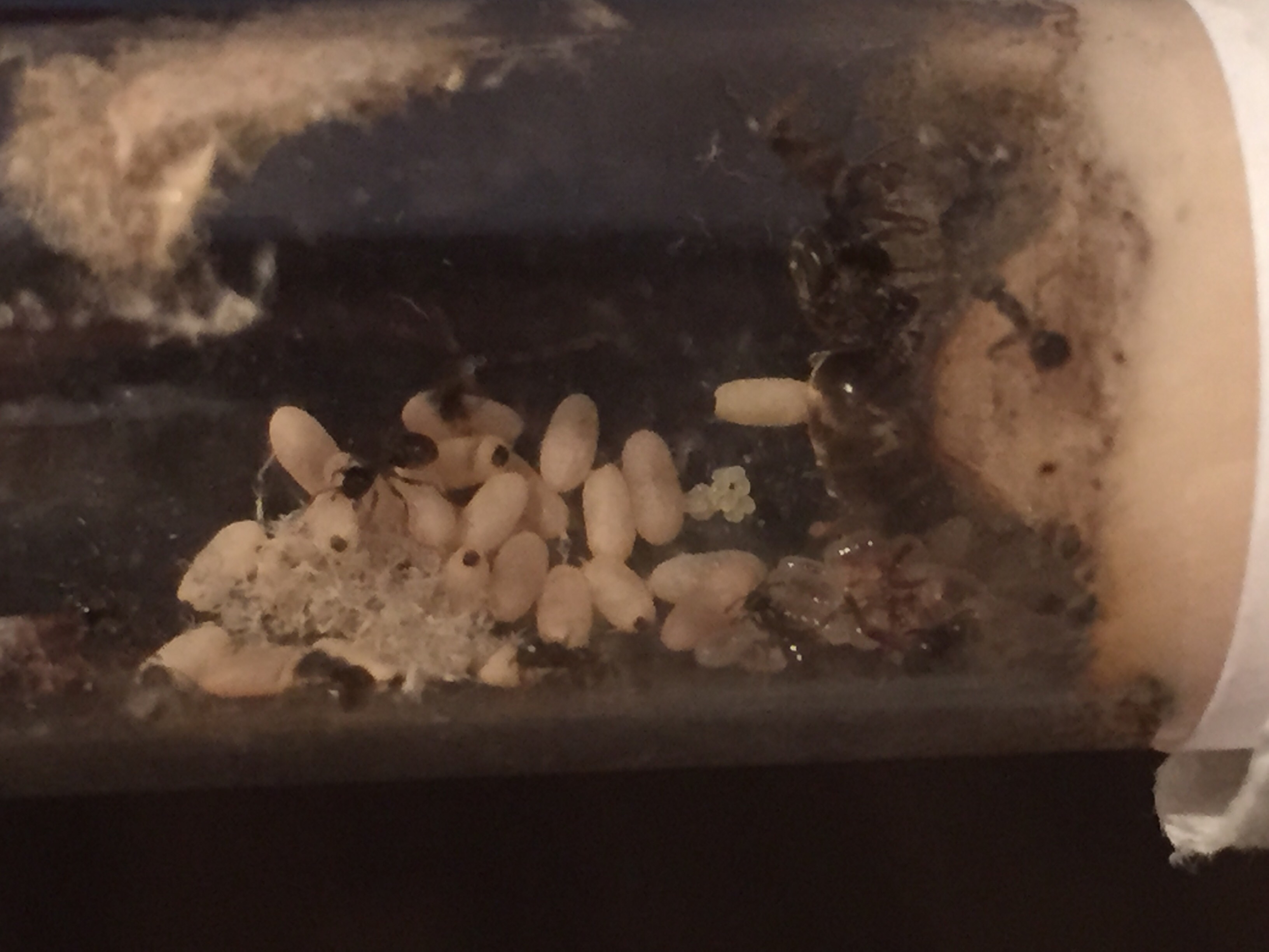 Auch die Anzahl der Arbeiter kann ich lediglich auf so 25-35 schätzen, denn es sind alleine gestern 5 neue Arbeiterinnen geschlüpft (einfach zu erkennen an den 5 sehr sehr hellen Tierchen).