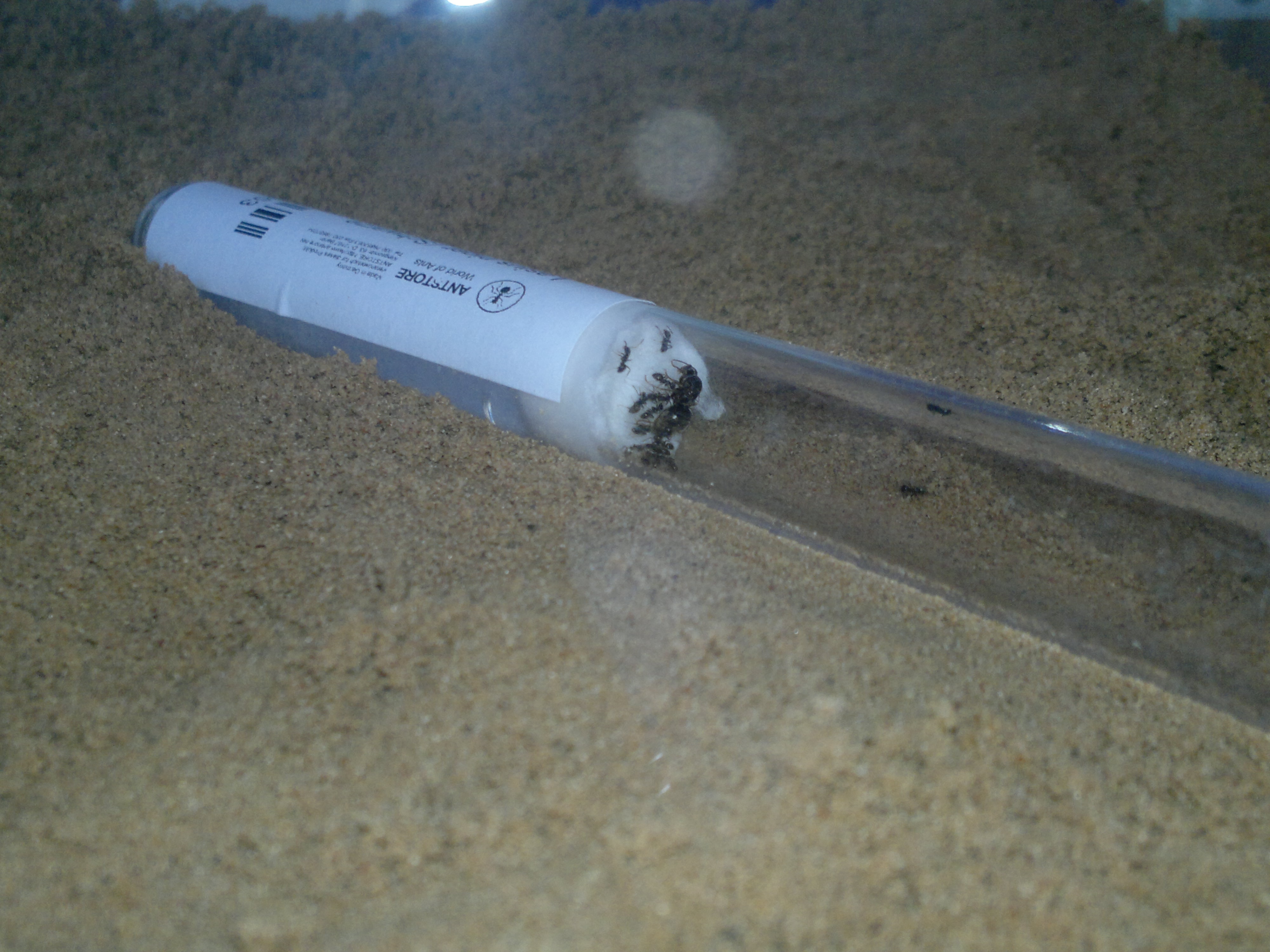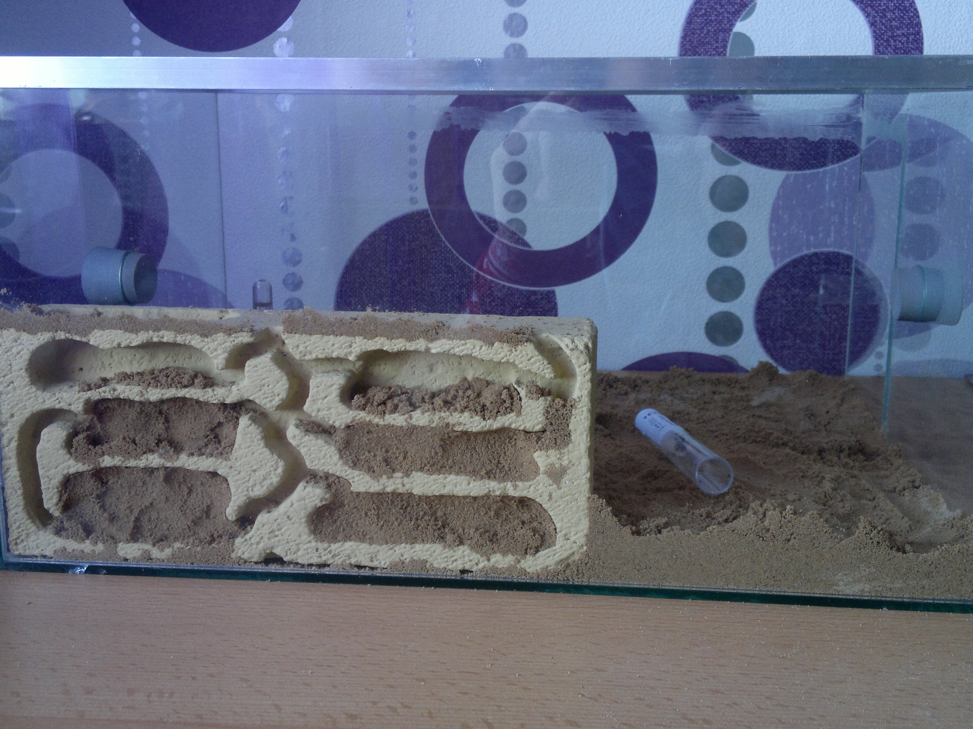 Ich habe zu den Ameisen gleich noch ein Betonnest bestellt und einfach erstmal an's Glas so gut wie es geht rangedrückt und mit Sand befestigt, ich will nämlich nicht wieder mit Silikon befestigen da mir das Nest irgendwie dafür zu schade ist, also hoffe ich doch das die Ameisen dann so schlau sind und die minimalen Lücken mit Sand ausfüllen werden.