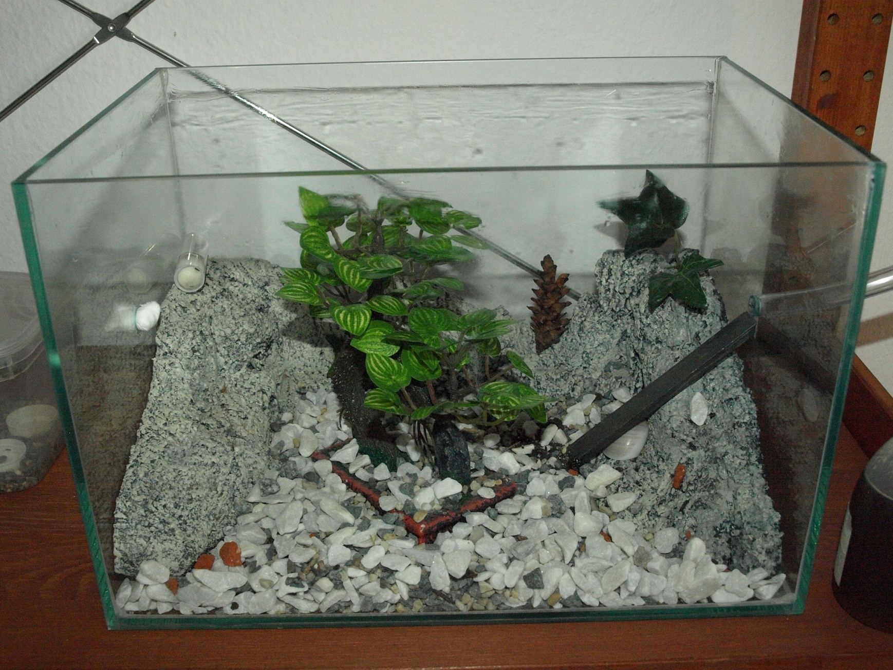 Anbei noch ein paar Bilder zum aktuellen Konstrukt. Das Nest hab ich jetzt einfach an die Wand geschraubt, die Arena steht im Regal daneben. In der Arena steht nun ein Plastikfantastic Bonsaibäumchen, den ich fürn Euro beim "Theoretiker"-Baumarkt erstanden habe. Auf diesen kleinen Blättern des Bäumchens, biete ich mittlerweile immer den Honig an. Jedes mal auf ein anderes Blatt...
