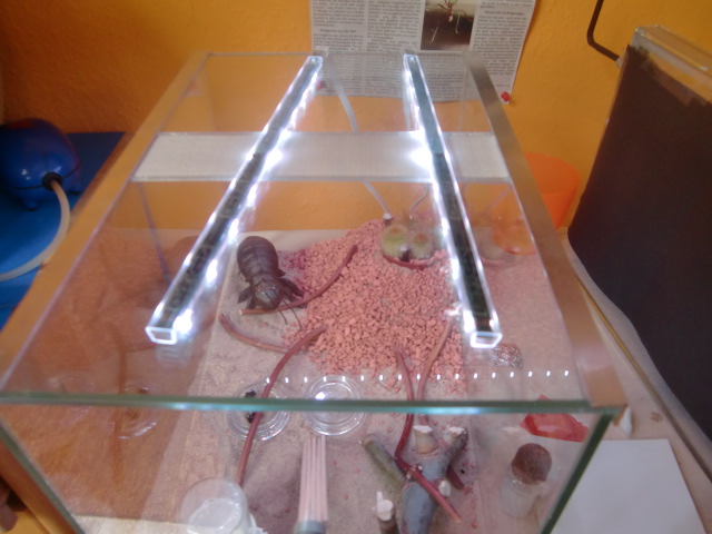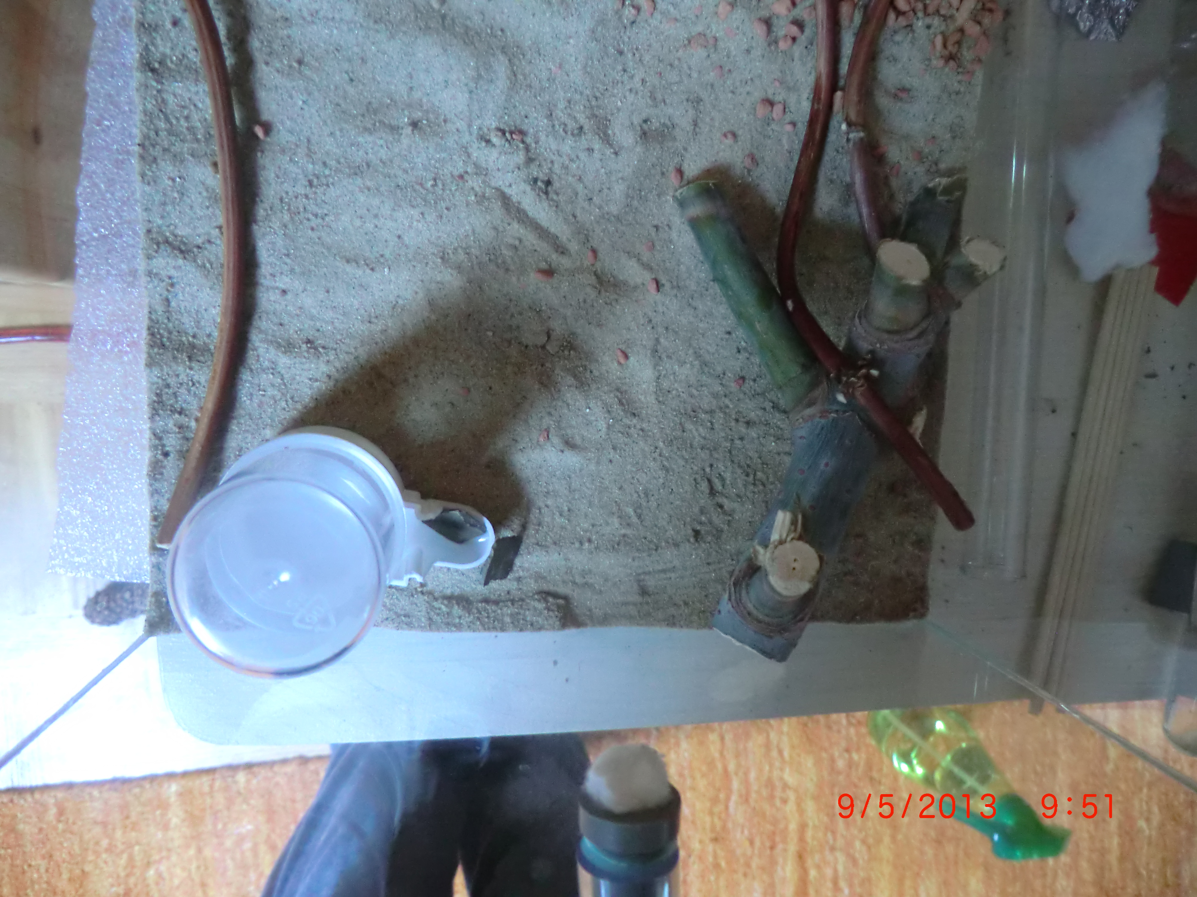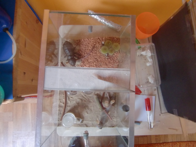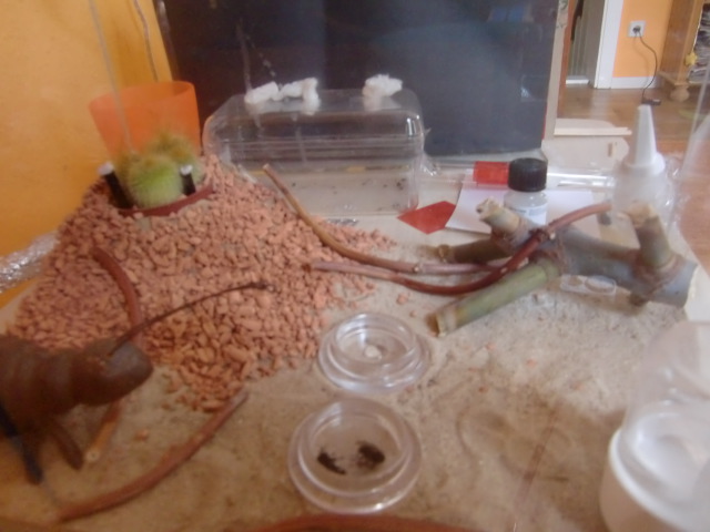 Da der Schlauch ja verschlossen ist (der zu Arena führt), weil ja die Sand-Lehmmischung trocknen muss, habe ich heute 2 kleine Fruchtfliegen im Schlauch angeboten. Sie wurden dankend angenommen. Wie lange dauert es denn ungefähr bis die Mischung in der Arena hart ist. Der Deckel ist geöffnet und wird immmer wieder am Tag kurz auf die Heizung gestellt. Hier bitte Antworten. Ansonsten danke für das lesen dieses Haltungsberichts.