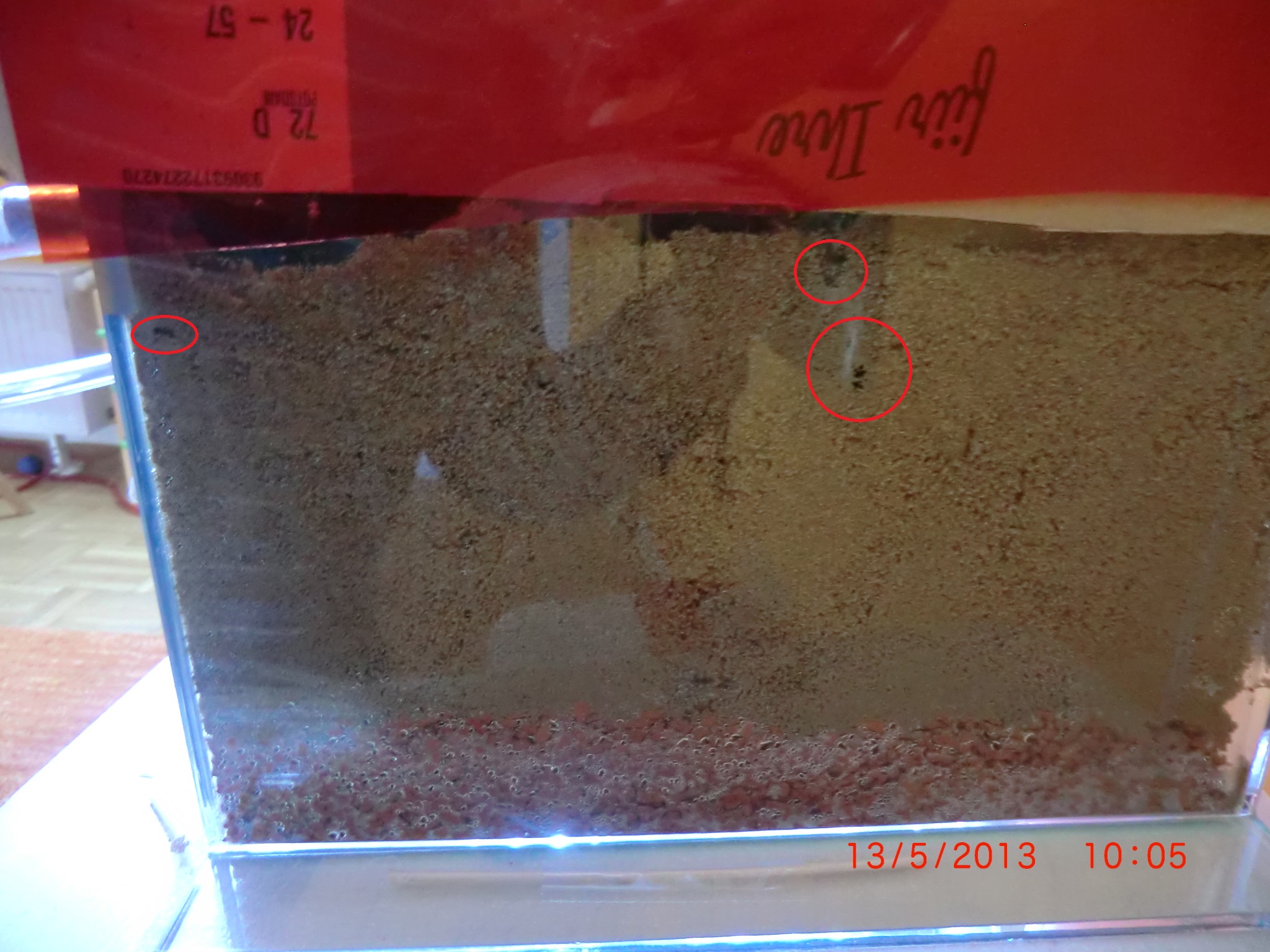 Die roten Kreise zeigen wo ihre Kammern sind und wo sie graben. Wie man sieht habe ich so gut wie keinen Einblick in die Farm. Heute wird die Watte vom Schlauch entfernt. Ich muss aber vorher noch Fliegen fangen, denn sie bekommen heute ein Festmahl:drink:.