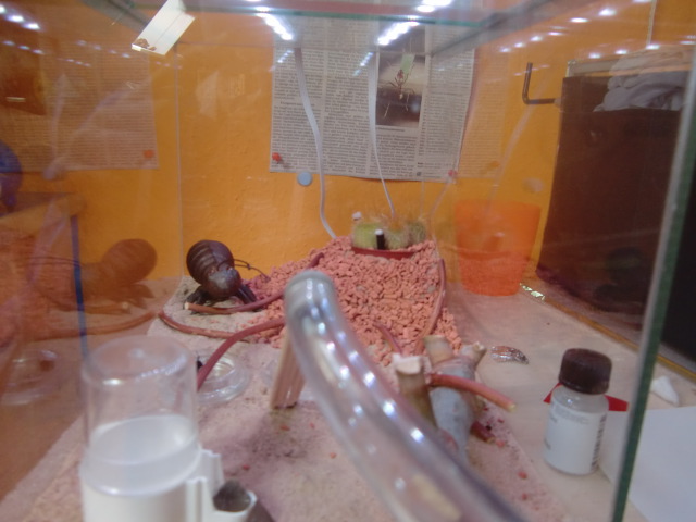 Sie sind wieder zurück in die Farm gezogen. Genau am nächsten Tag trugen sie wieder die Brut rüber und die Gyne lief ganz langsam wieder in die Farm.;) Das beste ist aber, das ich nun in eine Kammer gucken kann. Man sieht dort zwar nicht soooo viel, aber immmerhin konnte ich 2-3 Larven erkennen.:D:D Die Grabarbeiten sind im Kaktus auch wieder eingestellt. Ich werde aber erstmal keine Fotos von der Kammer machen, weil sie vieleicht die Kammer noch ausbauen.