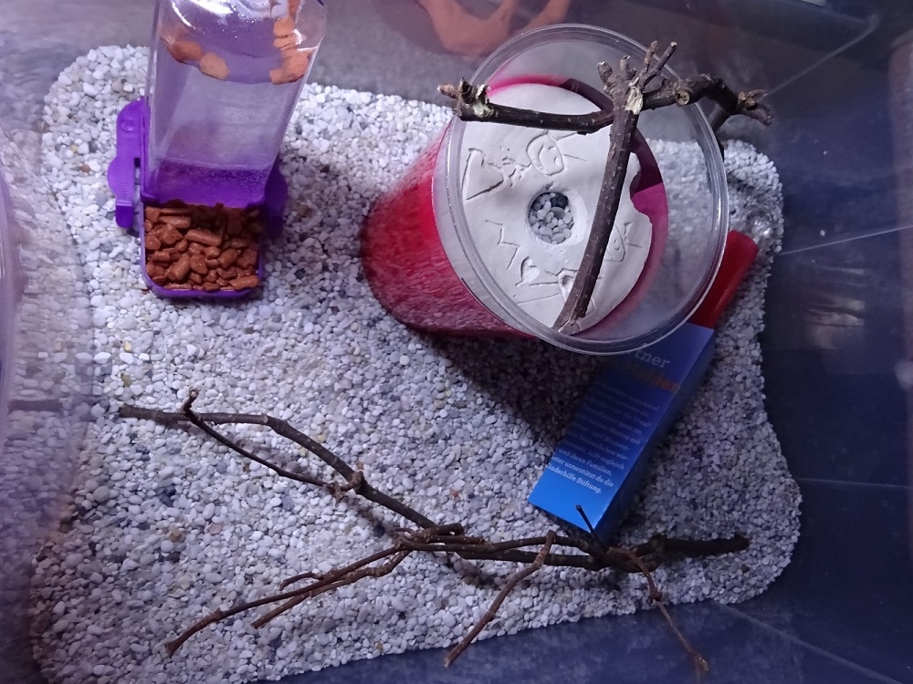 Momentan besitze ich 2 Arenen. Die große Arena (ca. 55 x 35 cm) hat 2 Ausgänge und es gibt einige Kunstblumen sowie Äste als Deko. Diese wird dieses Jahr aber wahrscheinlich nicht zum Einsatz kommen, was mir bewusst ist. Deswegen gibt es noch eine kleine Arena (ca. 35 x 25 cm) ohne Ausgänge und nur mit einigen Ästchen als Deko. Der Bodengrund bei beiden Arenen besteht aus einer Seramis-Schicht und oben drauf einer Aquarienkies-Schicht.