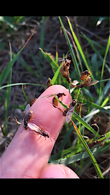 Einem Feld ,bemerkte ich unten am Feldrand lauter Männchen und Königinen . Ich denke sie wahren kurz davor los zu fliegen aber es ist doch etwas spät für einen Lasius niger schwarmflug . Ich war mir ziemlich sicher dass es auch Lasius niger war den es wahren ja Arbeiterinnen auch mit dabei , würde mich auf einpar kommetare freuen was ihr dazu meint den es ist ja schließlich schon September.