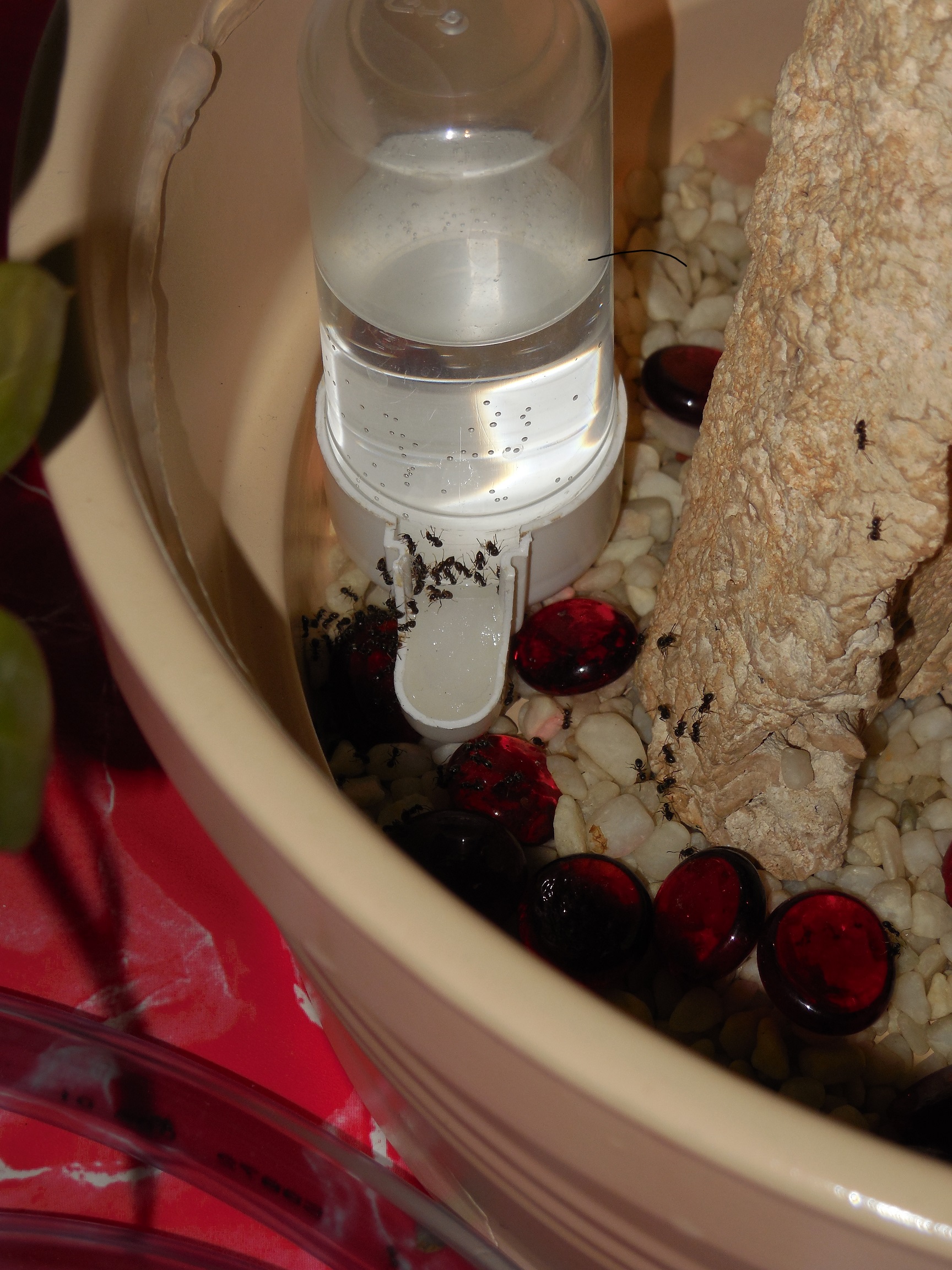 Die kleine Glasarena wird kaum noch genutzt, seitdem ich die Tränke in eine der Schalen verbracht habe. Die Watte an den Tränken sowie ein Stück in der Schlaubrücke (über der 2. Schale von links) sind beliebte Lagerplätze. Dort halten sich immer viele Tiere auf. Evtl. versuchen sie sich bei den Tränken auch, in die Watte einzubuddeln.