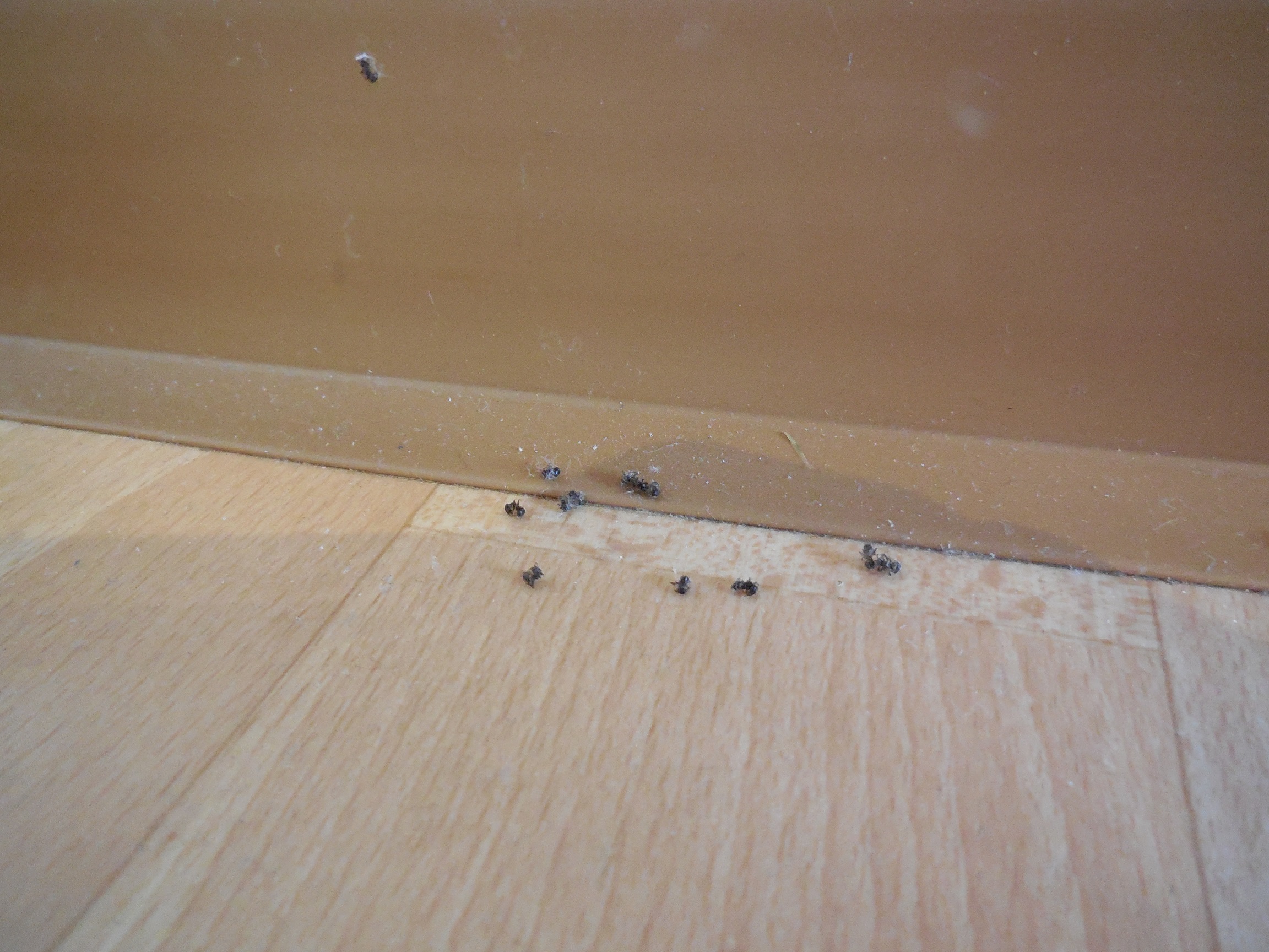 Live konnte ich keine beim Sterben beobachten. Ich weiß daher nicht, ob die, wie Erne oben angemerkt hat, als Leichen abgeladen wurden, beim Hochklettern draufgingen oder "versehentlich" verklebten: ich sehe immer wieder einzelne Exemplare den Silikonrand entlanglaufen, der den Ölrand nach unten begrenzt. Die könnten schnell mal in einen Tropfen geraten. Nur bei den denen, die weiter oben klebten, musste entweder die Tote oder die Trägerin ein Stück übers Öl gelaufen sein.