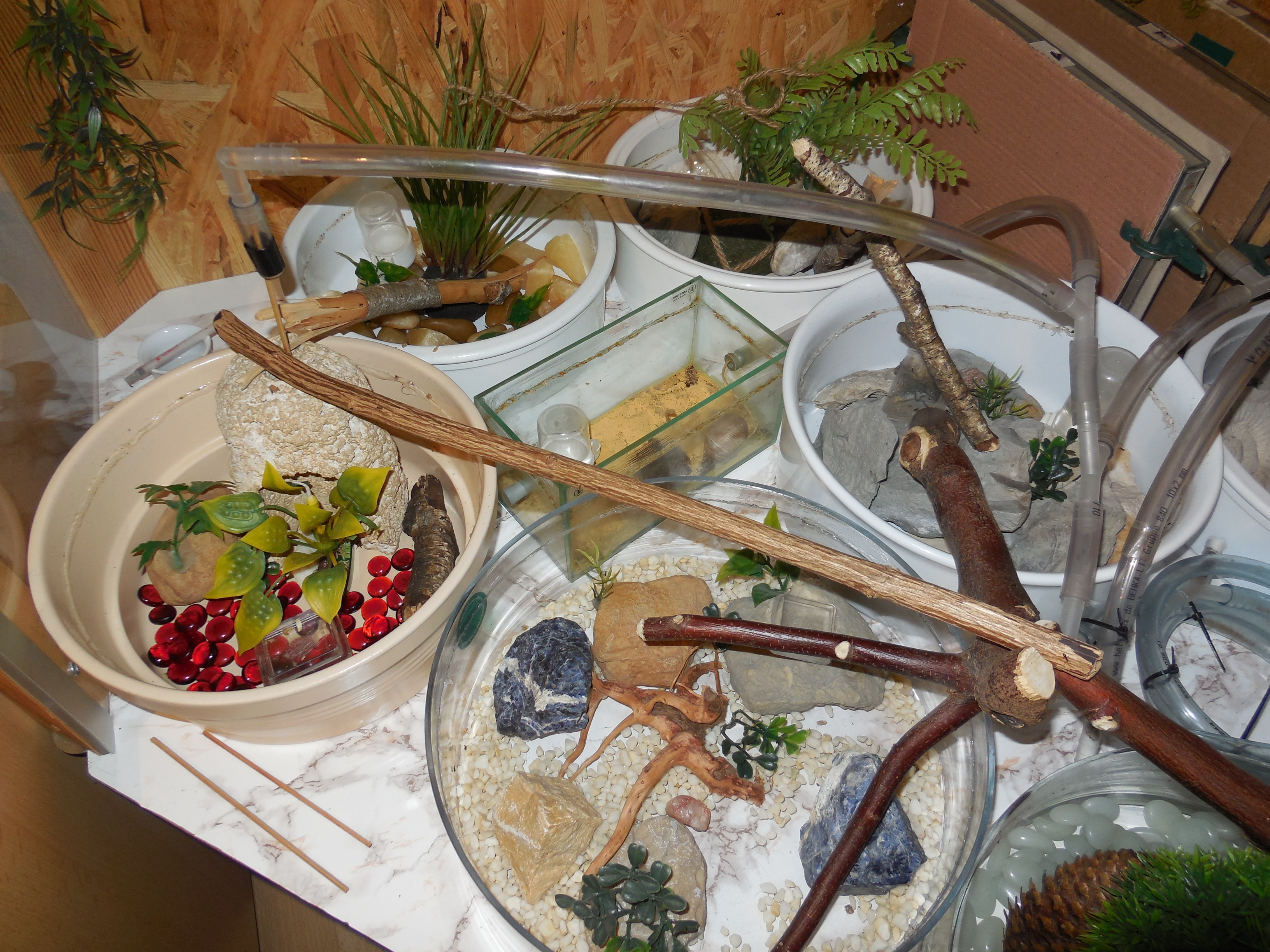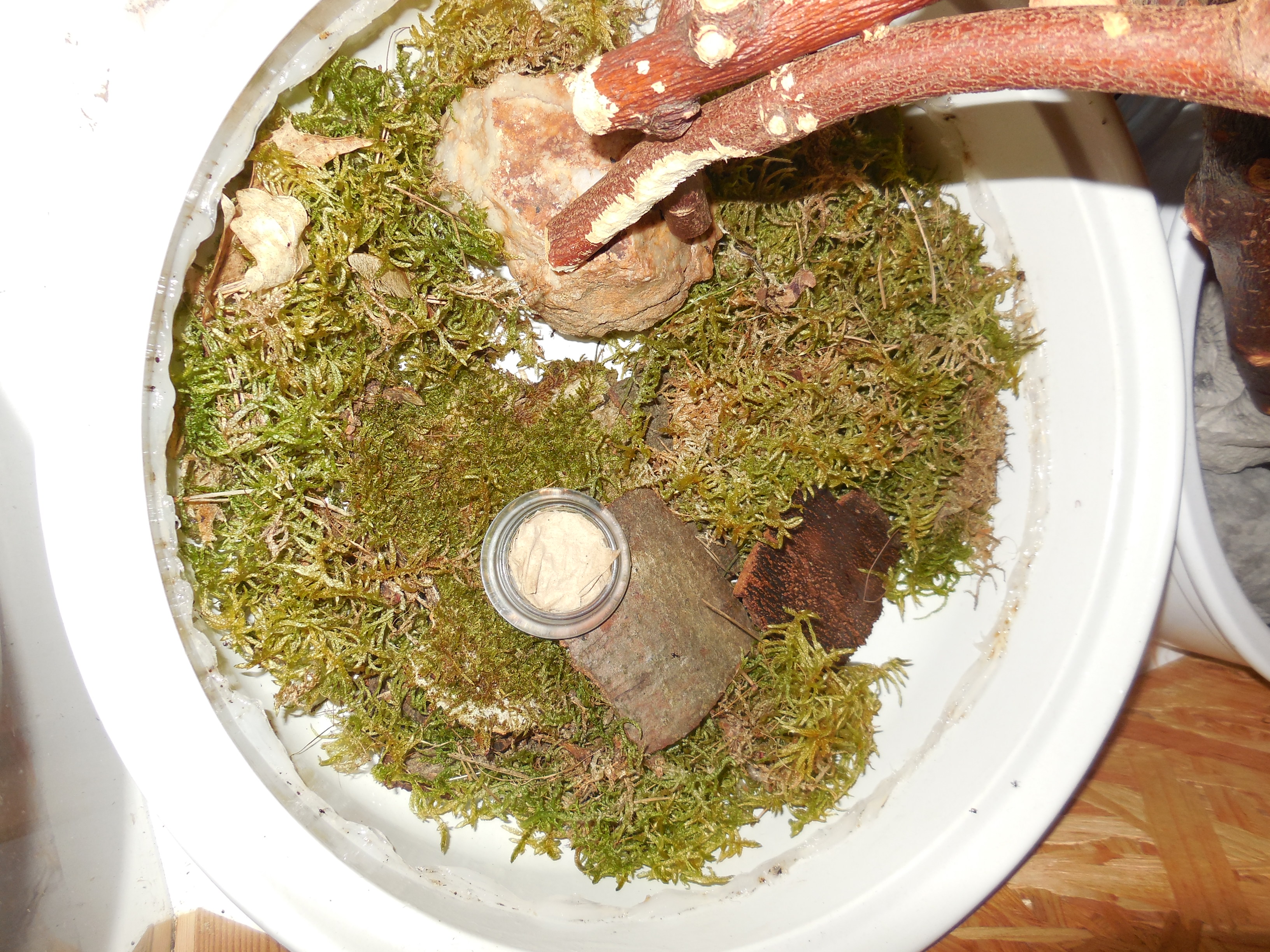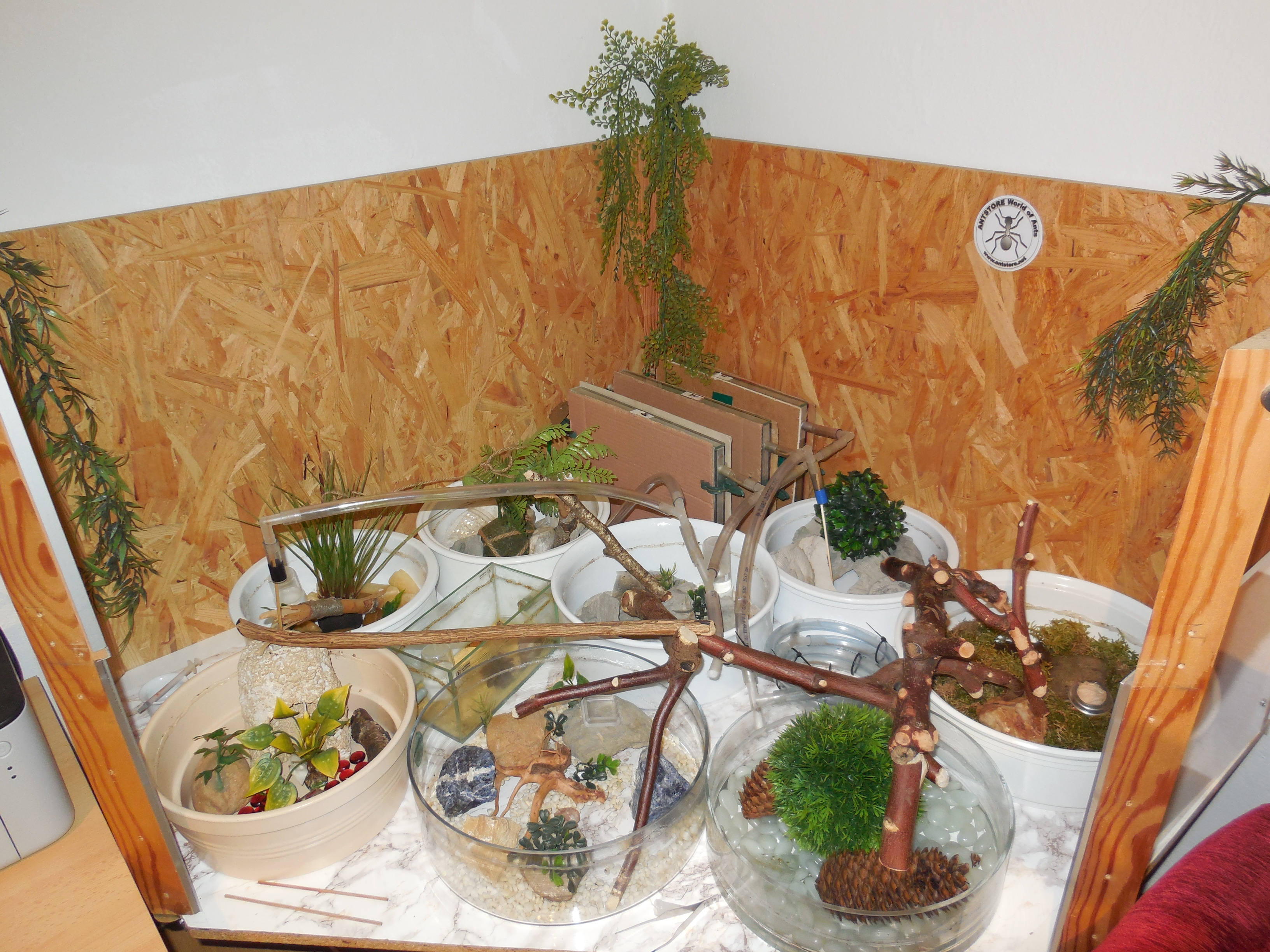 Seit ca. 3 Wochen steht die Kolonie wieder in der Wohnung. Dieses Jahr wieder in der alten Ecke, d.h. gleich links neben dem Fenster, wo sie bis auf letztes Jahr immer untergebracht war. Allerdings nicht mehr auf einem Tisch sondern - wie letztes Jahr - im alten Rennmausgehege. Platzbedingt haben sie heuer 1 Arena weniger, was allerdings nicht weiter auffällt. Es ist zwar durchaus was los, aber von überlaufen weit entfernt. Kein Vergleich mehr zu den frühen Jahren. Laut den Müllhäufchen hat auch ein ganzer Schwung den Winter nicht überlebt, was allerdings auch bislang der Fall war. Neu ist eine "Naturarena": die ist mit Rinde und Moos bestückt und tatsächlich die Beliebteste. Ich denke wegen der Feuchtigkeit. Ich hoffe, das Moos hält möglichst lange durch.