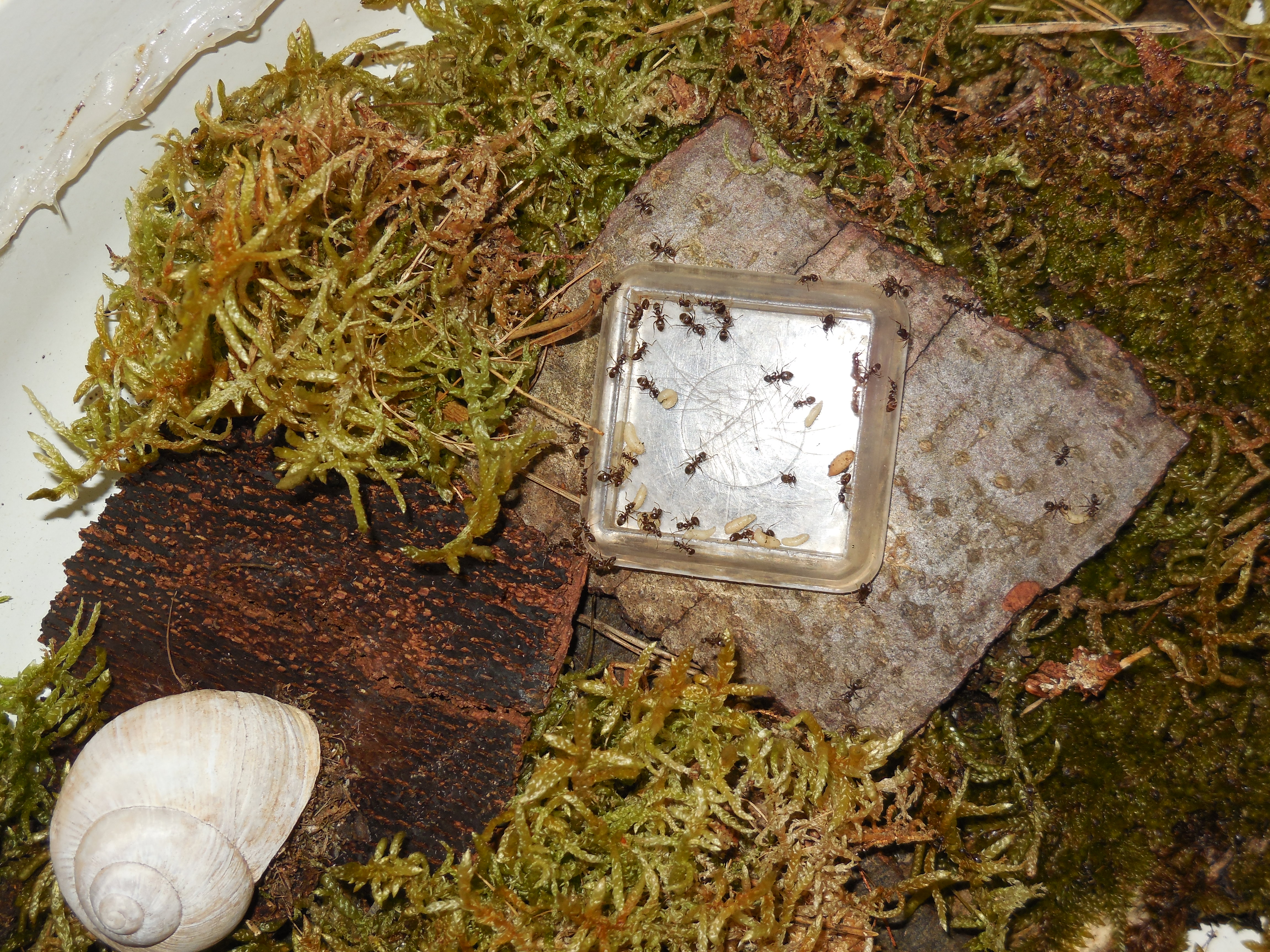 Heute habe ich 4 Arenen abgekoppelt in denen zusammen nur 1 Ameise war. Bei der 5. (der mit dem Moos) erlebte ich allerdings eine Überraschung: da tummelte sich ein ganzer Schwung unter einem Moosbüschel. Diese Arena habe noch drangelassen. Dass es die Belebteste ist wusste ich, hätte aber trotzdem nicht mit so vielen Tieren gerechnet. Ich habe früher schon immer mal wieder unter's Moos gespitzt, allerdings an anderen Stellen. Dort war zum Schluss auch nicht mehr viel los.