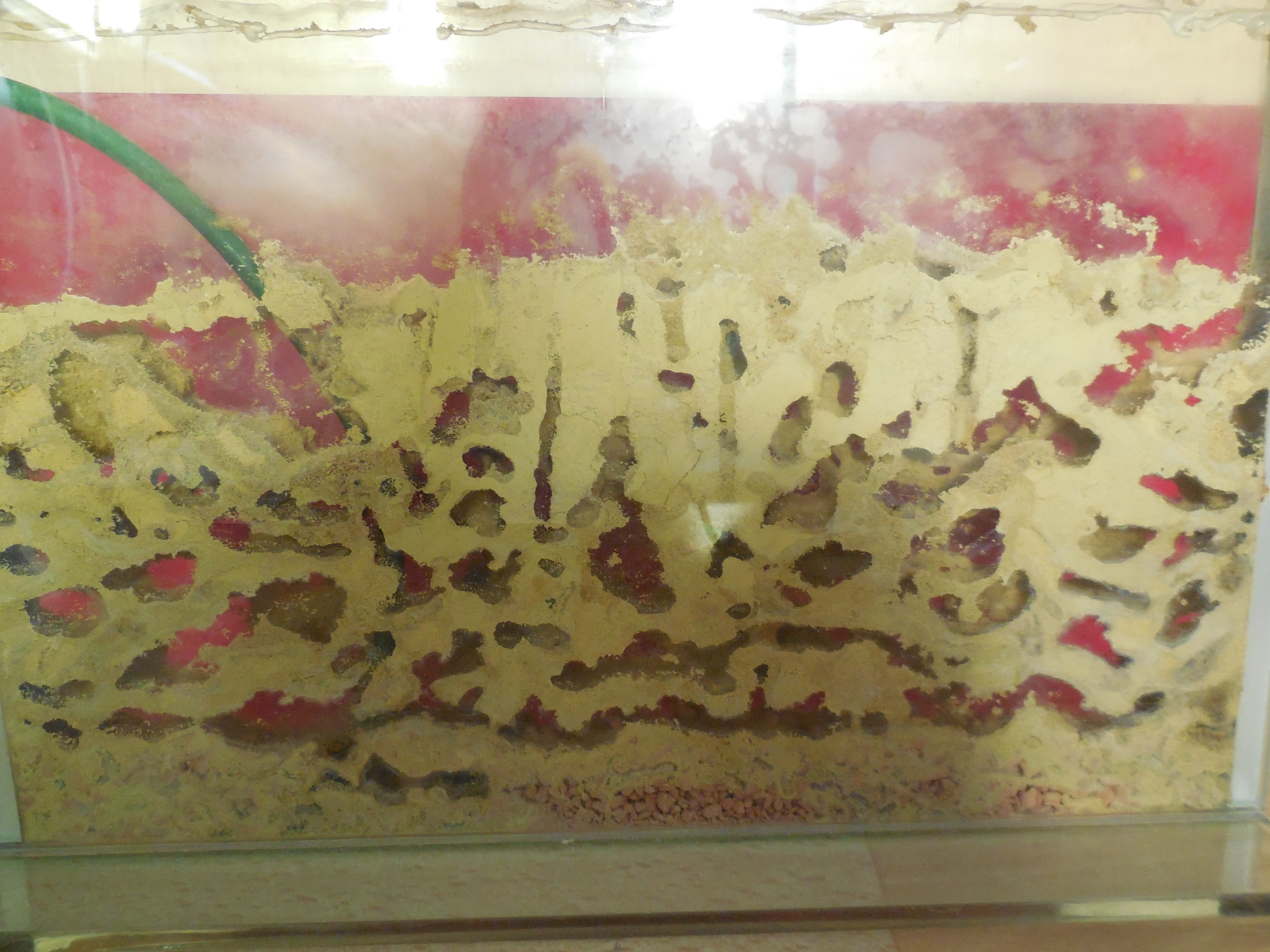 Ich habe mir die leeren Farmen angeschaut: beide waren knochentrocken. Dass es mit dem Durchzug bei der Bewässerung nicht so klappt war ja schon immer so, aber dass es so schlimm ist, hätte ich nicht gedacht. Faktisch war alles festgebacken, inkl. einer Schicht unten über dem Granulat. Da konnte nix mehr durchziehen. Wahrscheinlich habe ich vor laute Angst die Tiere zu ersaufen v.a. im Winter zu wenig bewässert. Dass ich wenig wässere weiß ich, bin aber immer davon ausgegangen, dass die sich auch Feuchtigkeit aus den Tränken holen. Eventuell liegt das Schrumpfen der Kolonie also nicht nur am Alter und der Bejagung durch Spinnen
