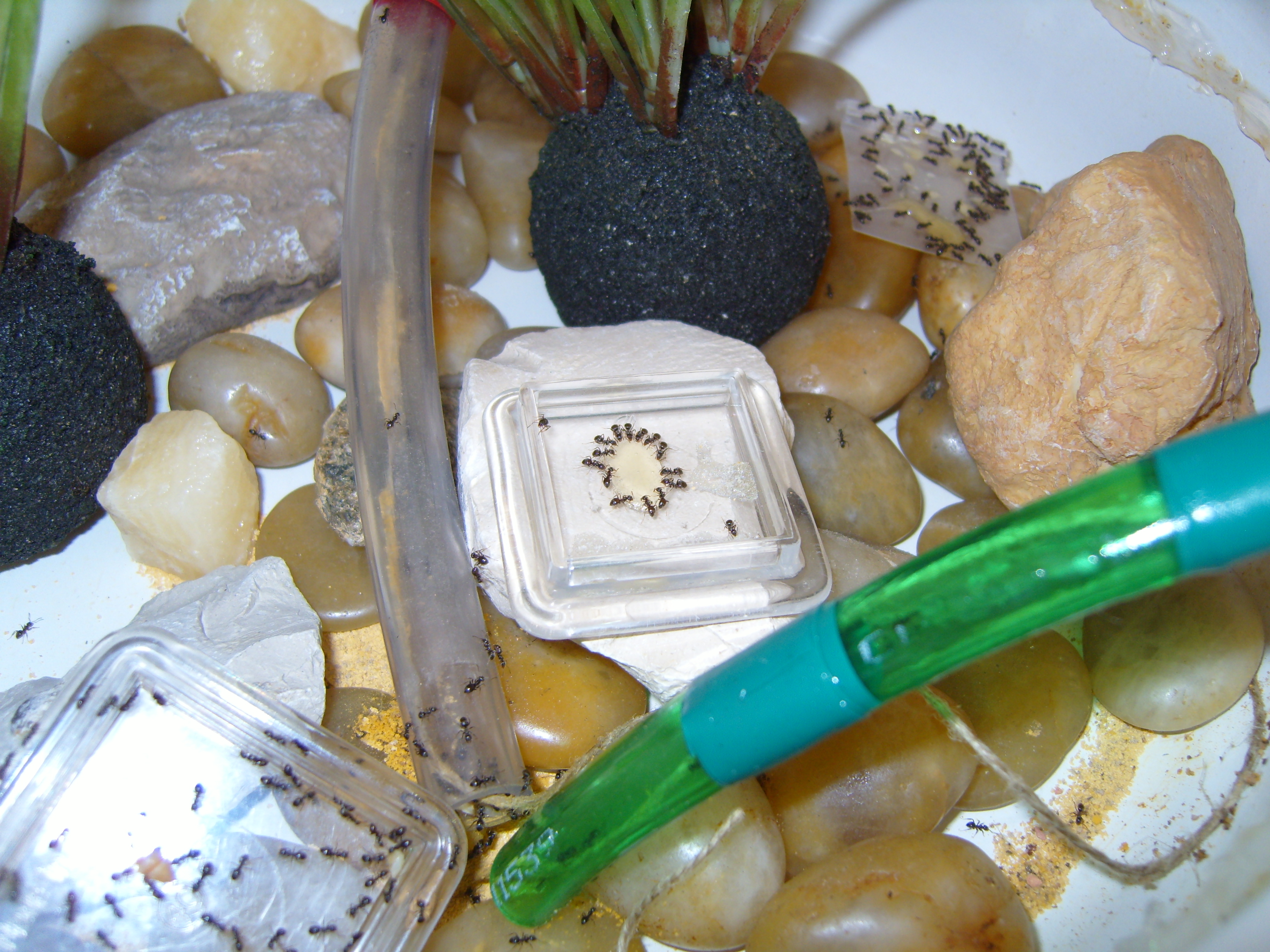 Eines der Keramikbecken ist mit grobem Kies ausgelegt. An einer Stelle haben die Ameisen einen Haufen Sand dazu ausgebreitet. Auch die Glasarena ist gut mit Sand bestückt worden. Würde micht echt interessieren, warum.