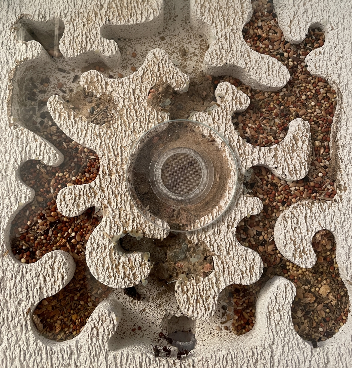 Nach etwa zwei Minuten bemerkte die erste Ameise das Futter, lief etwa fĂŒnf oder sechs mal alleine hin und her, danach liess sich Rekrutierung beobachten. Sie traf am Eingang zwei etwas grössere, die gingen mit und ab da wurden es schnell mehr, sogar zwei kleine Majore machten mit!