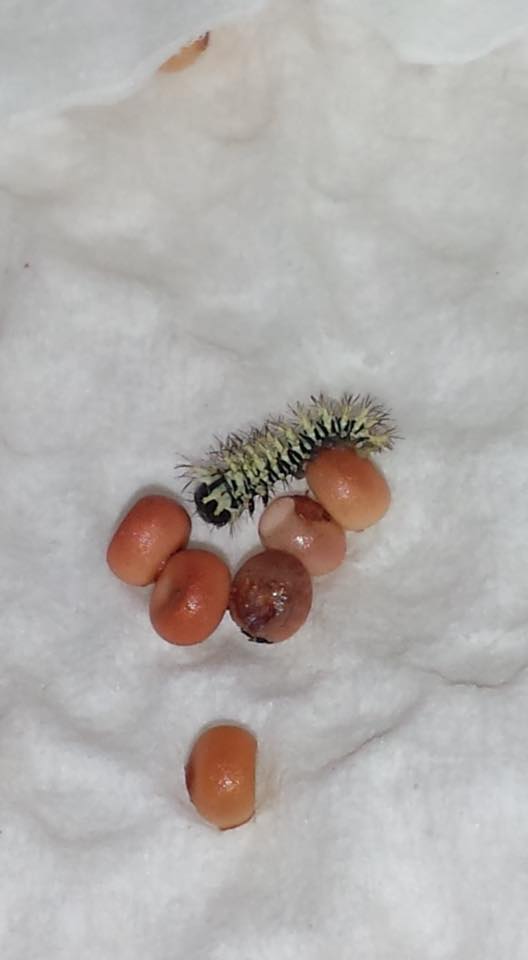 Heute sind die ersten Räupchen geschlüpft, eine davon habe ich mal für euch in Szene gesetzt, hier sind schon richtig gut weise Auswüchse und ein schwarzer Kopf zu erkennen. In diesem Stadium spricht man von einer Eiraupe oder einer Raupe im Larvenstadium 1 (L1)