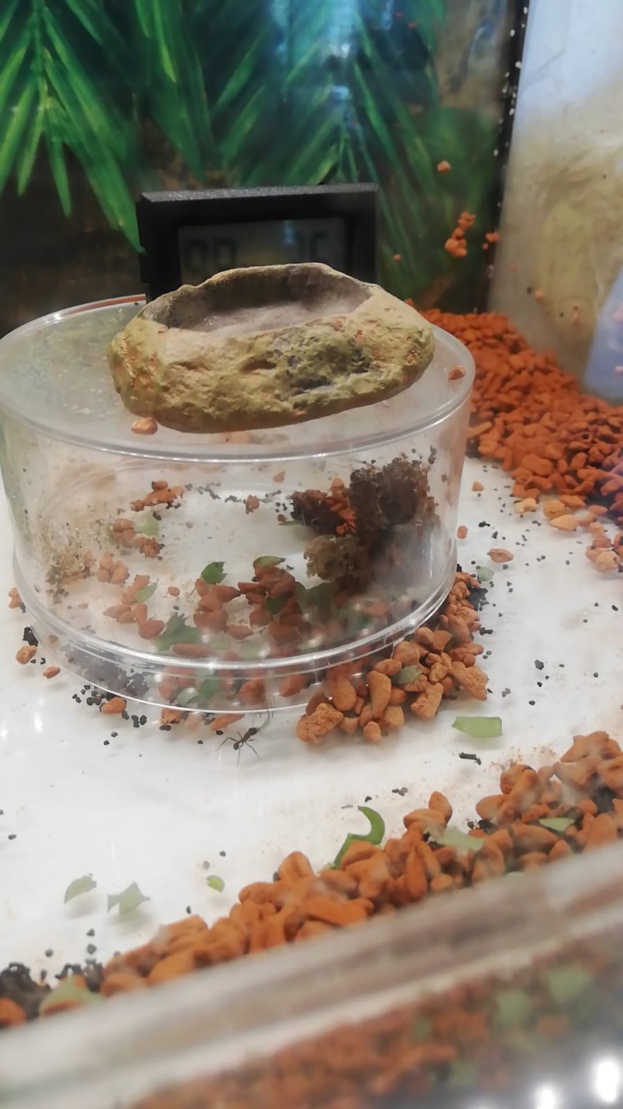 Nun seit ich diese verkleinert habe um ca. 50 % Innenvolumen, ist auch immer ein ganz leichter Beschlag zu sehen ohne Tröpfchenbildung. Wenn ich sehe was die jetzt an 2-3 Tagen geschafft haben, bin ich schon wieder optimistischer. Aber die Temperaturen sind nach wie vor für viele Halter ein Problem. Die Ameisen vertragen das wohl leicht, in so einer mittelamerikanischen Steppe wirds wohl schon auch mal so richtig warm. Aber der Pilz hält nicht so viel aus. Da wir Menschen gerne den Fortschritt und das Leben auf dem Pilz bewundern wollen stellen wir den Pilz meist exponiert auf, in der Natur befindet sich dieser in Erdkavernen wo immer eine konstante Kühle und Feuchtigkeit herrscht - Eine der großen Herausforderungen