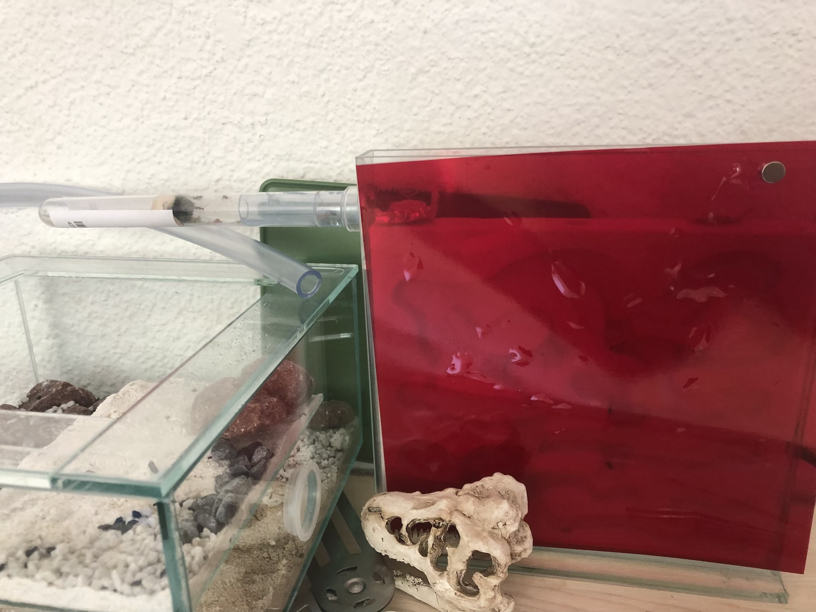 Ich habe das RG dann mal abgedeckt und die Watte ist pechschwarz. Sie haben das Gips-Nest und ein frisches RG schon seit langem zu VerfĂĽgung, ziehen aber nicht um. Schlussendlich habe ich nun das RG abgedeckt direkt an das Gipsnest angeschlossen in der Hoffnung, dass sie umziehen (siehe Foto). Aber sie haben absolut kein Interesse daran, das RG ĂĽberhaupt zu verlassen, obschon inzwischen auch fast kein Wasser mehr im Tank ist. Ich fĂĽttere sie nun so gut es geht direkt im RG und die