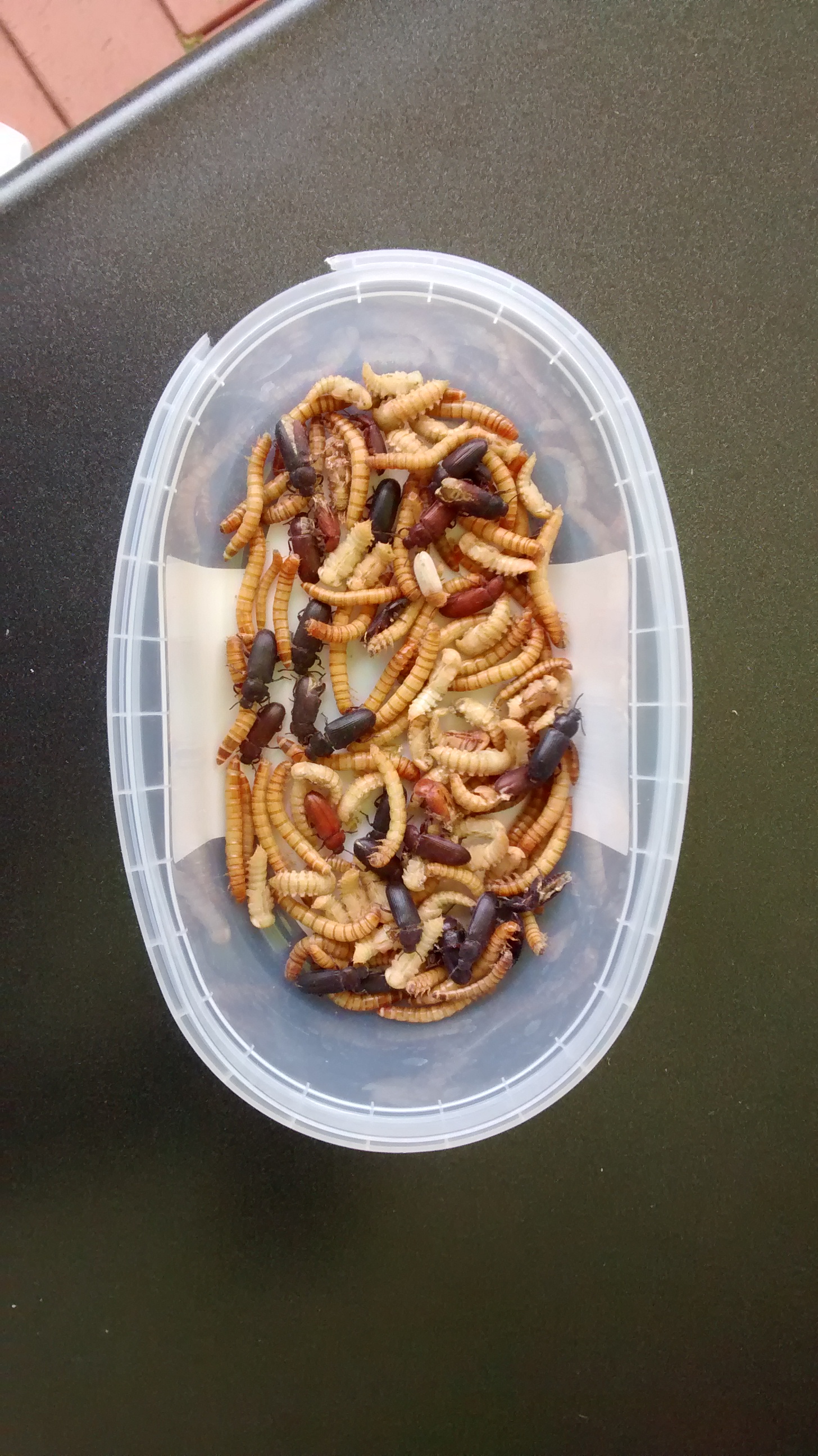 Hierzu kann man einfach eine ganz normale handelsübliche Box Mehlwürmer in das Becken schütten.