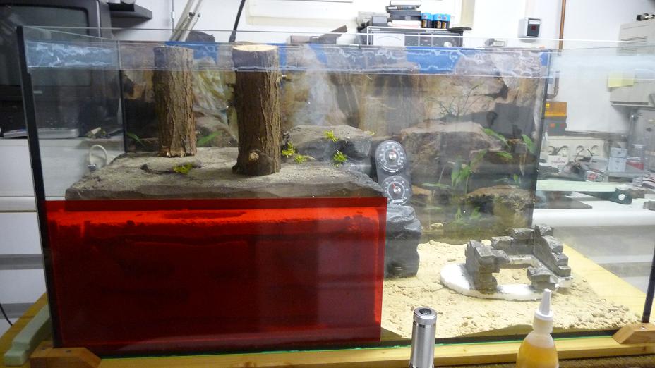 Was nun noch folgen muss, ist die tatsĂ€chliche Belebung des Waldbodens mit Tannennadeln und evtl. Pinienrinde und die Gestaltung des Bodens vor dem groĂen Berg. Ich denke, hier komme ich um etwas Sand/Lehmgemisch nicht gut herum. Das Gewicht des gesamten Aquariums sollte allerdings auch dann noch von wenigstens 2 Personen zu bewĂ€ltigen sein.