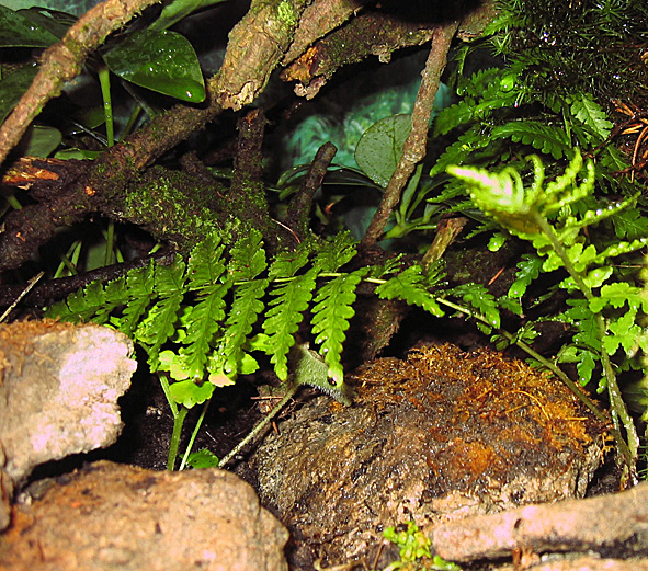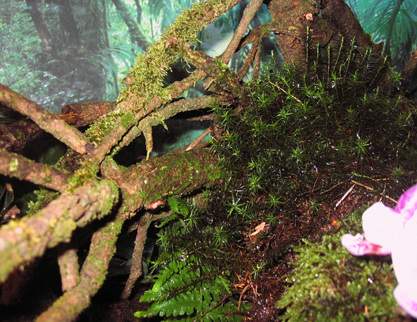 ich zwei 60 Watt und eine 20 Watt Leuchtstoffröhre fĂŒr die Terraristik mit hohen UV-Anteil verwendet. Die Beregnungsanlage ist eine Super Rain von Lucky Reptil, die 2x am Tag Ă 45 Sekunden lĂ€uft. Verwendet wird Regenwasser. Die Luftfeuchtigkeit betrĂ€gt je nach Standort 50-85%, die Temperatur 22–28 Grad.
