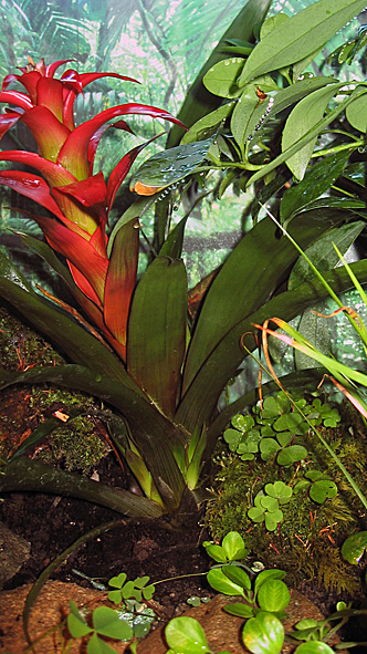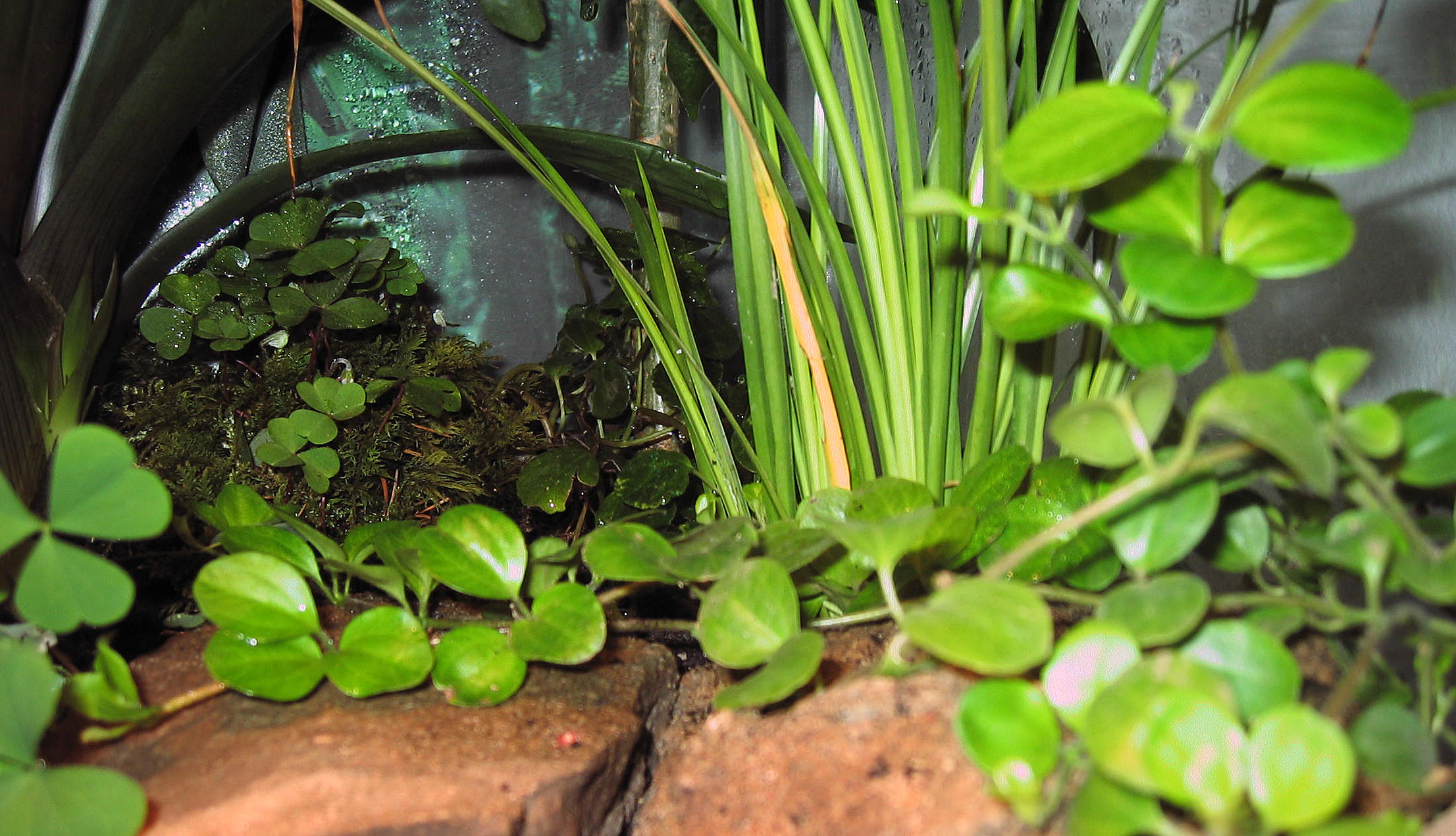 Die Erde, das Moos, die grosse mit Moos bewachsene Wurzel habe ich aus dem Wald. Die Beflanzung besteht aus verschieden einheimischen und tropischen Pflanzen, die ich nach eigenem Befinden zusammen gestellt habe. Durch das Einbrigen von natĂŒrlichen und unbehandelten Stoffe, habe ich auch gleich diverse andere Tiere bewusst und umbewusst, wie RegenwĂŒrmer, diverse KĂ€fer, Spinnen, Assel usw. eingesetzt.