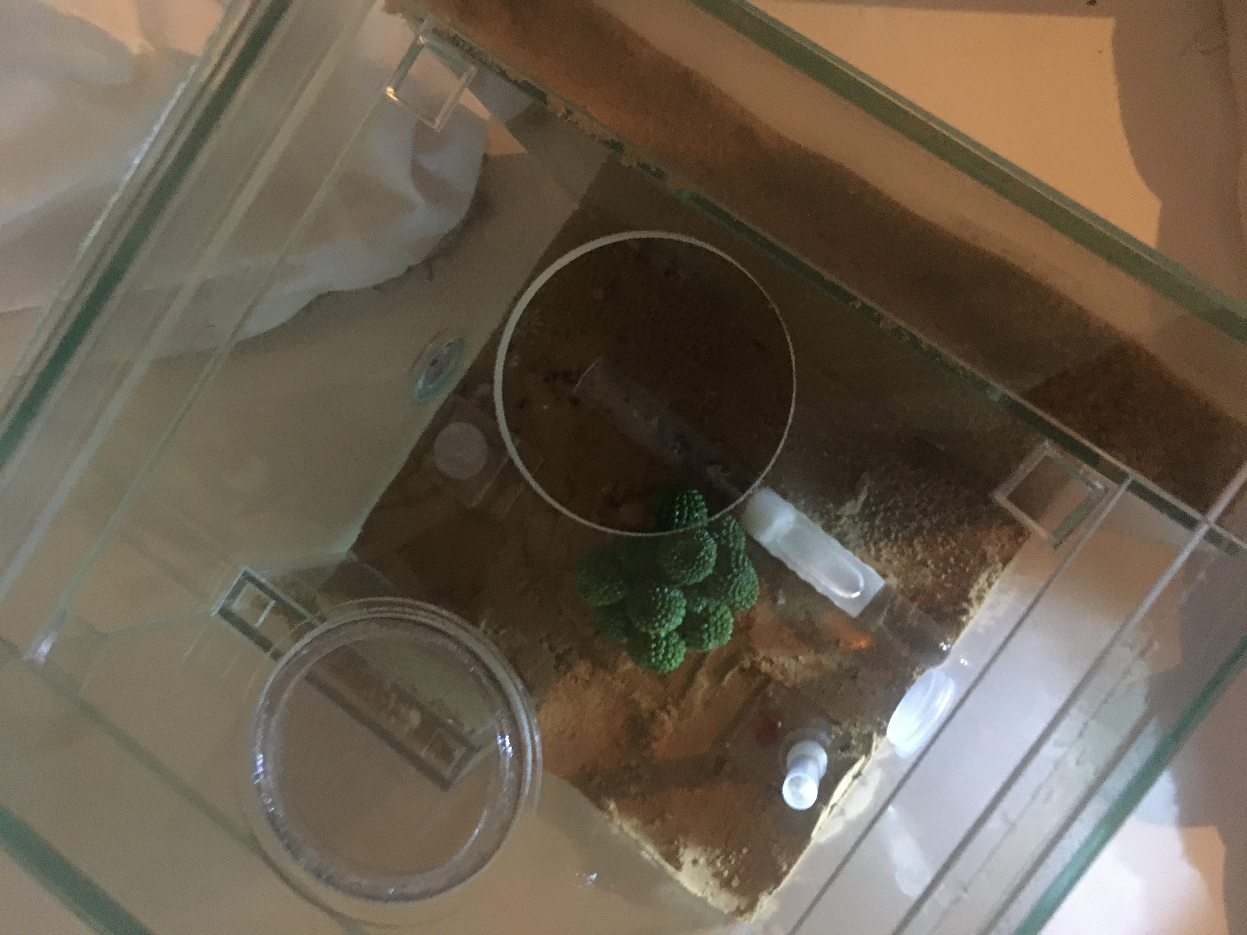 Ein feuchtes Nest, ein trockenes, das offene Röhrchen hineingelegt. Nach einer Stunde war die Königin schon umgezogen, damit hatte ich nicht gerechnet, jetzt liegen 8 Arbeiterinnen tot rum.