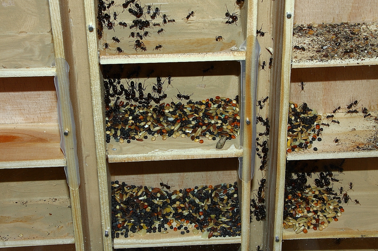 Der liegende Nestblock (Gips/Zement) ist voller geworden, allerdings wäre immer noch ausreichend Platz für die Körnersammlung dieser Ameisen.